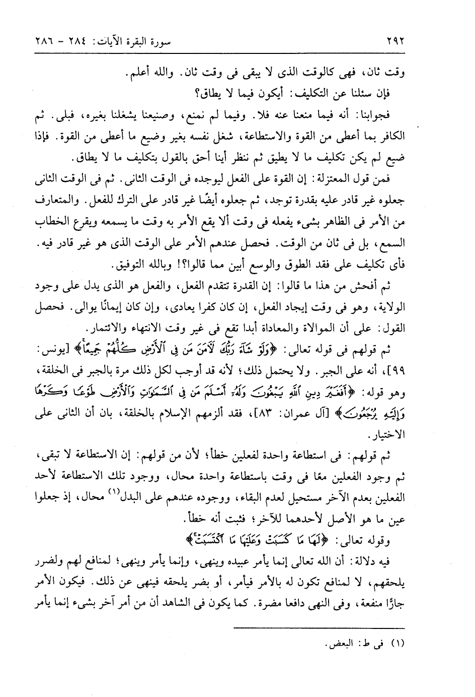 فمن دول المعتزلة: إن القوة على الفعل ليوجده في الوقت الثاني، ثم في الوقت الثاني جعلوه غير قادر عليه بقدرة توجد، ثم جعلوه أيضًا غير قادر على الترك للفعل. والمتعارف من الأمر في الظاهر بشيء يفعله في وقت ألا يقع الأمر به وقت ما يسمعه ويقرع الخطاب السمع، بل في ثان من الوقت. فحصل عندهم الأمر على الوقت الذي هو غير قادر فيه.