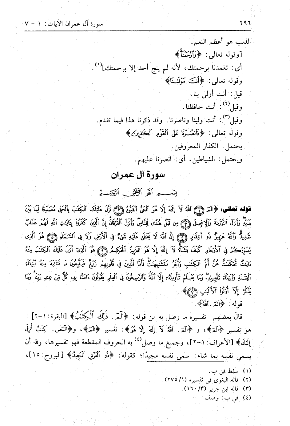 قوله تعالى: (الم (1) اللَّهُ لَا إِلَهَ إِلَّا هُوَ الْحَيُّ الْقَيُّومُ (2) نَزَّلَ عَلَيْكَ الْكِتَابَ بِالْحَقِّ مُصَدِّقًا لِمَا بَيْنَ يَدَيْهِ وَأَنْزَلَ التَّوْرَاةَ وَالْإِنْجِيلَ (3) مِنْ قَبْلُ هُدًى لِلنَّاسِ وَأَنْزَلَ الْفُرْقَانَ إِنَّ الَّذِينَ كَفَرُوا بِآيَاتِ اللَّهِ لَهُمْ عَذَابٌ شَدِيدٌ وَاللَّهُ عَزِيزٌ ذُو انْتِقَامٍ (4) إِنَّ اللَّهَ لَا يَخْفَى عَلَيْهِ شَيْءٌ فِي الْأَرْضِ وَلَا فِي السَّمَاءِ (5) هُوَ الَّذِي يُصَوِّرُكُمْ فِي الْأَرْحَامِ كَيْفَ يَشَاءُ لَا إِلَهَ إِلَّا هُوَ الْعَزِيزُ الْحَكِيمُ (6) هُوَ الَّذِي أَنْزَلَ عَلَيْكَ الْكِتَابَ مِنْهُ آيَاتٌ مُحْكَمَاتٌ هُنَّ أُمُّ الْكِتَابِ وَأُخَرُ مُتَشَابِهَاتٌ فَأَمَّا الَّذِينَ فِي قُلُوبِهِمْ زَيْغٌ فَيَتَّبِعُونَ مَا تَشَابَهَ مِنْهُ ابْتِغَاءَ الْفِتْنَةِ وَابْتِغَاءَ تَأْوِيلِهِ وَمَا يَعْلَمُ تَأْوِيلَهُ إِلَّا اللَّهُ وَالرَّاسِخُونَ فِي الْعِلْمِ يَقُولُونَ آمَنَّا بِهِ كُلٌّ مِنْ عِنْدِ رَبِّنَا وَمَا يَذَّكَّرُ إِلَّا أُولُو الْأَلْبَابِ (7)