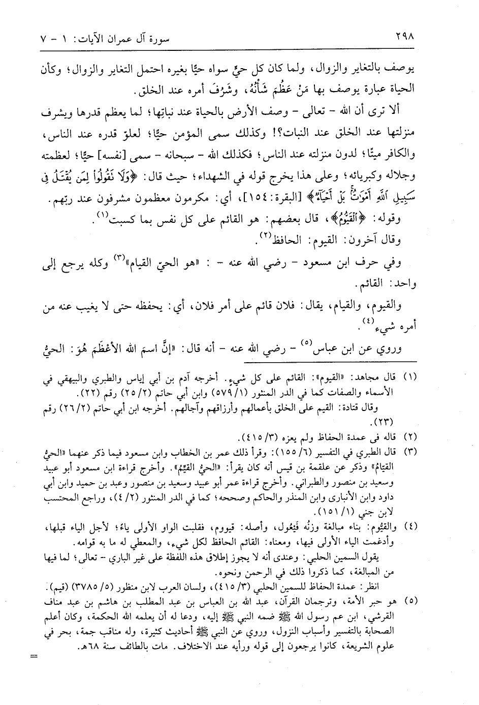 وروي عن ابن عَبَّاسٍ - رَضِيَ اللَّهُ عَنْهُ - أنه قال: " إنَّ اسمَ اللَّه الأعْظَمَ هُوَ: الْحَيُّ