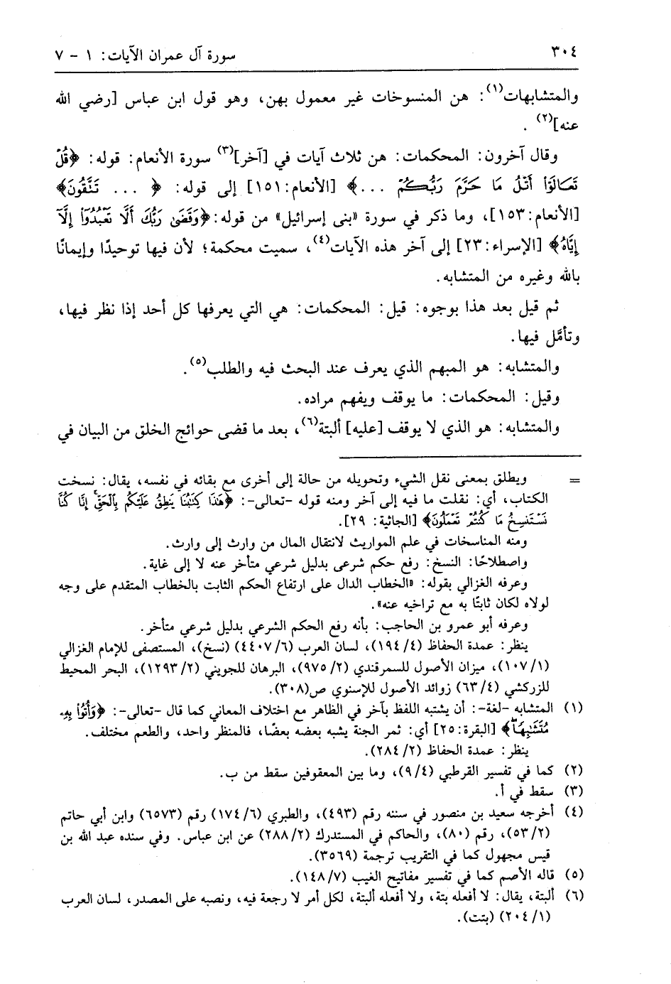 وقال آخرون: المحكمات: هن ثلاث آيات في آخر سورة الأنعام: قوله: (قُلْ تَعَالَوْا أَتْلُ مَا حَرَّمَ رَبُّكُمْ. . .)، إلى قوله: (. . . تَتَّقُونَ)، وما ذكر في سورة " بني إسرائيل " من قوله: (وَقَضَى رَبُّكَ أَلَّا تَعْبُدُوا إِلَّا إِيَّاهُ)، إلى آخر هذه الآيات، سميت محكمة؛ لأن فيها توحيدًا وإيمانًا باللَّه وغيره من المتشابه.