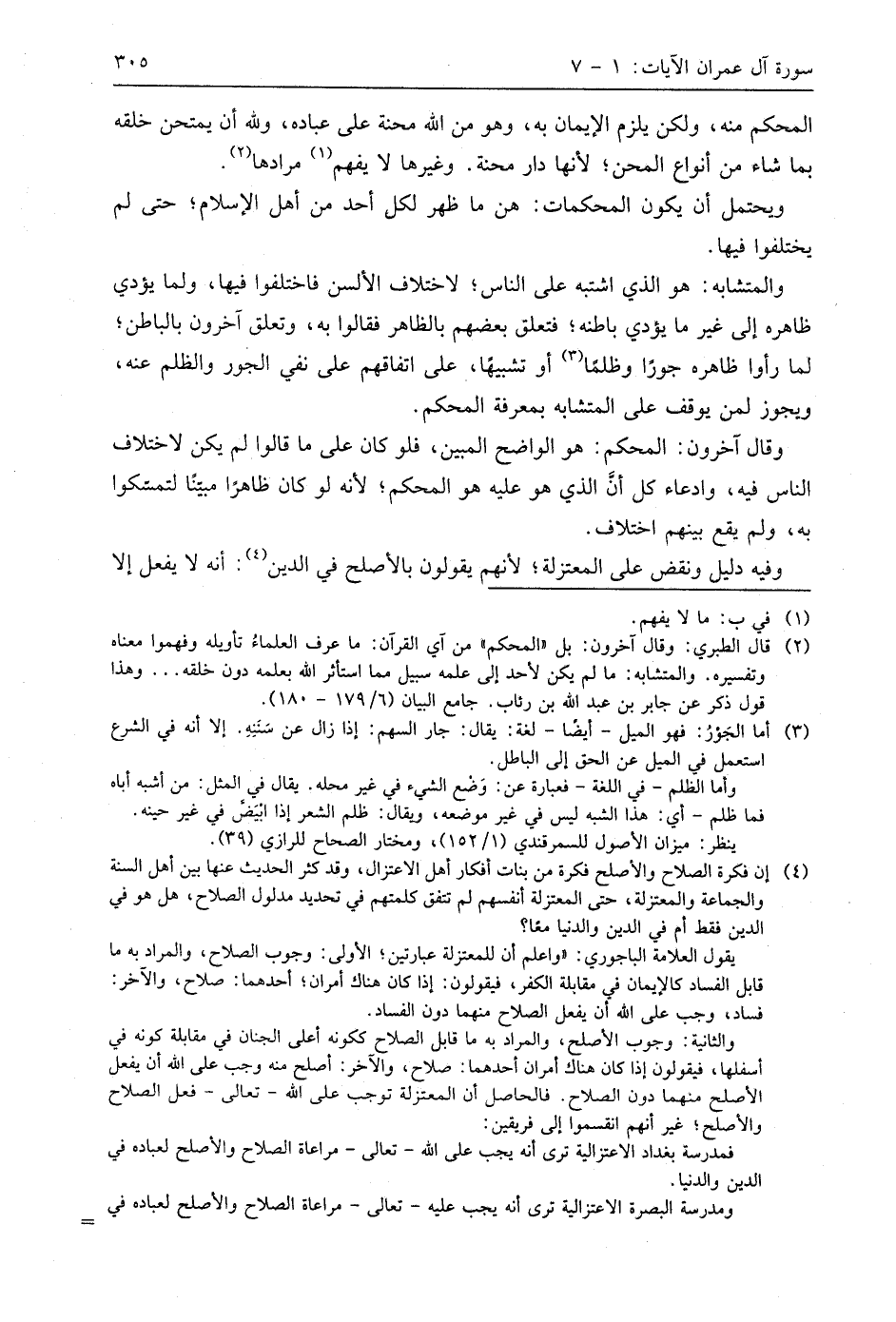 والمتشابه: هو الذي اشتبه على الناس؛ لاختلاف الألسن فاختلفوا فيها، ولما يؤدي ظاهره إلى غير ما يؤدي باطنه؛ فتعلق بعضهم بالظاهر فقالوا به، وتعلق آخرون بالباطن؛ لما رأوا ظاهره جورًا وظلمًا أو تشبيهًا، على اتفاقهم على نفي الجور والظلم عنه، ويجوز لمن يوقف على المتشابه بمعرفة المحكم.