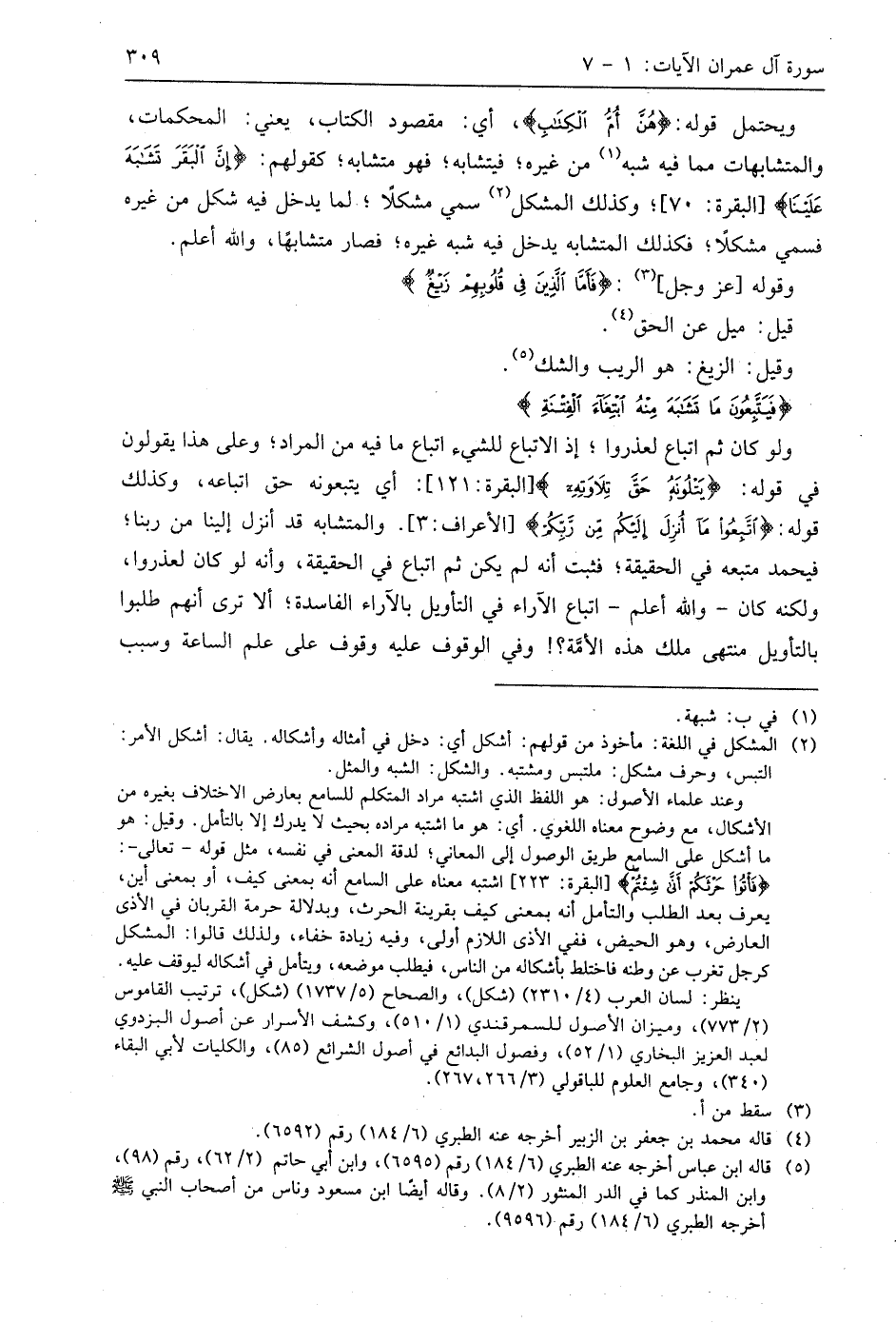 ولو كان ثم اتباع لعذروا؛ إذ الاتباع للشيء اتباع ما فيه من المراد؛ وعلى هذا يقولون في قوله: (يَتْلُونَهُ حَقَّ تِلَاوَتِهِ): أي يتبعونه حق اتباعه، وكذلك قوله: (اتَّبِعُوا مَا أُنْزِلَ إِلَيْكُمْ مِنْ رَبِّكُمْ). والمتشابه قد أنزل إلينا من ربنا؛ فيحمد متبعه في الحقيقة؛ فثبت أنه لم يكن ثم اتباع في الحقيقة، وأنه لو كان لعذروا، ولكنه كان - واللَّه أعلم - اتباع الآراء في التأويل بالآراء الفاسدة؛ ألا ترى أنهم طلبوا بالتأويل منتهى ملك هذه الأمَّة؟! وفي الوقوف عليه وقوف على علم الساعة وسبب