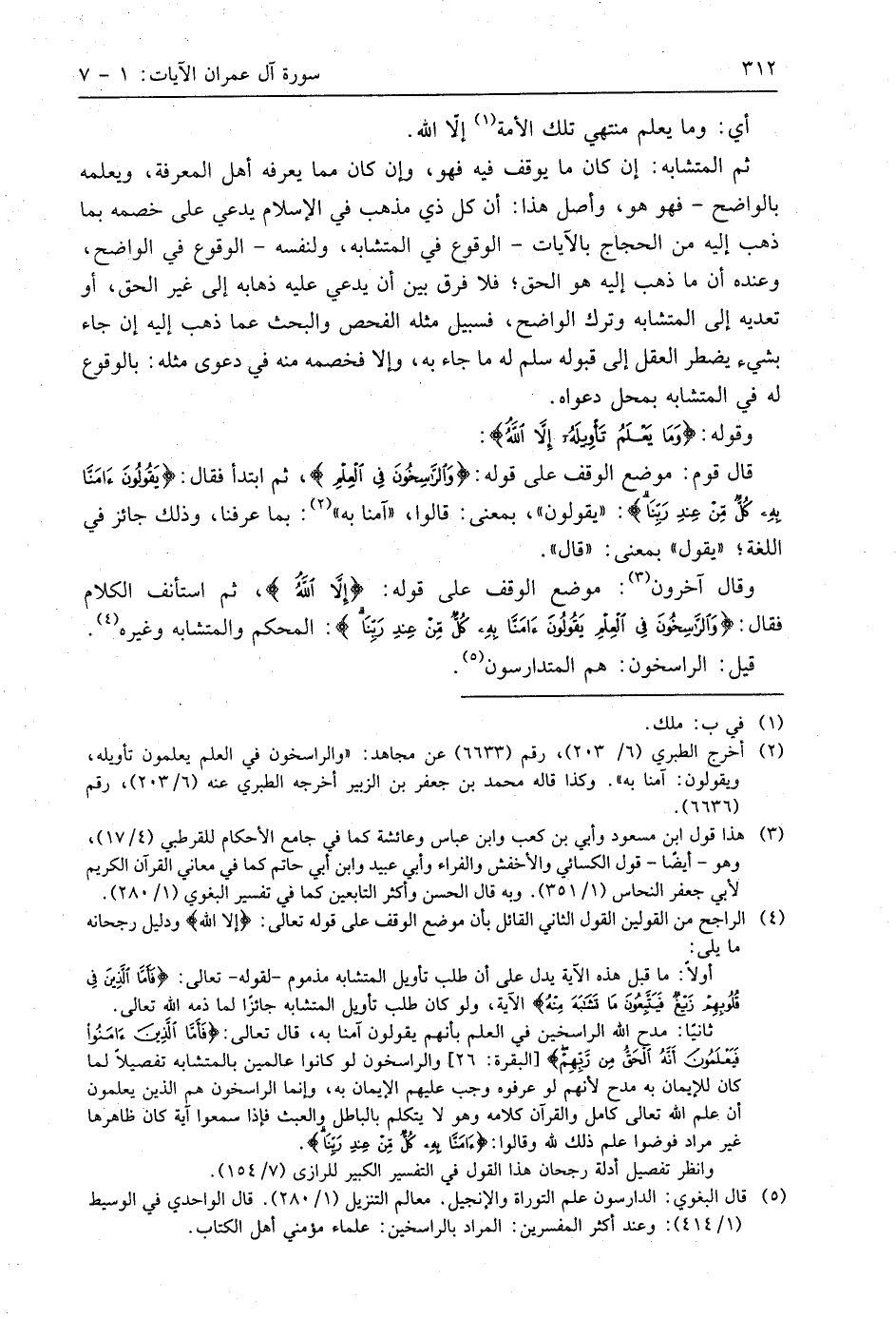 وقال آخرون: موضع الوقف على قوله: (إِلا اللَّهُ)، ثم استأنف الكلام فقال: (وَالرَّاسِخُونَ فِي الْعِلْمِ يَقُولُونَ آمَنَّا بِهِ كُلٌّ مِنْ عِنْدِ رَبِّنَا): المحكم والمتشابه وغيره.