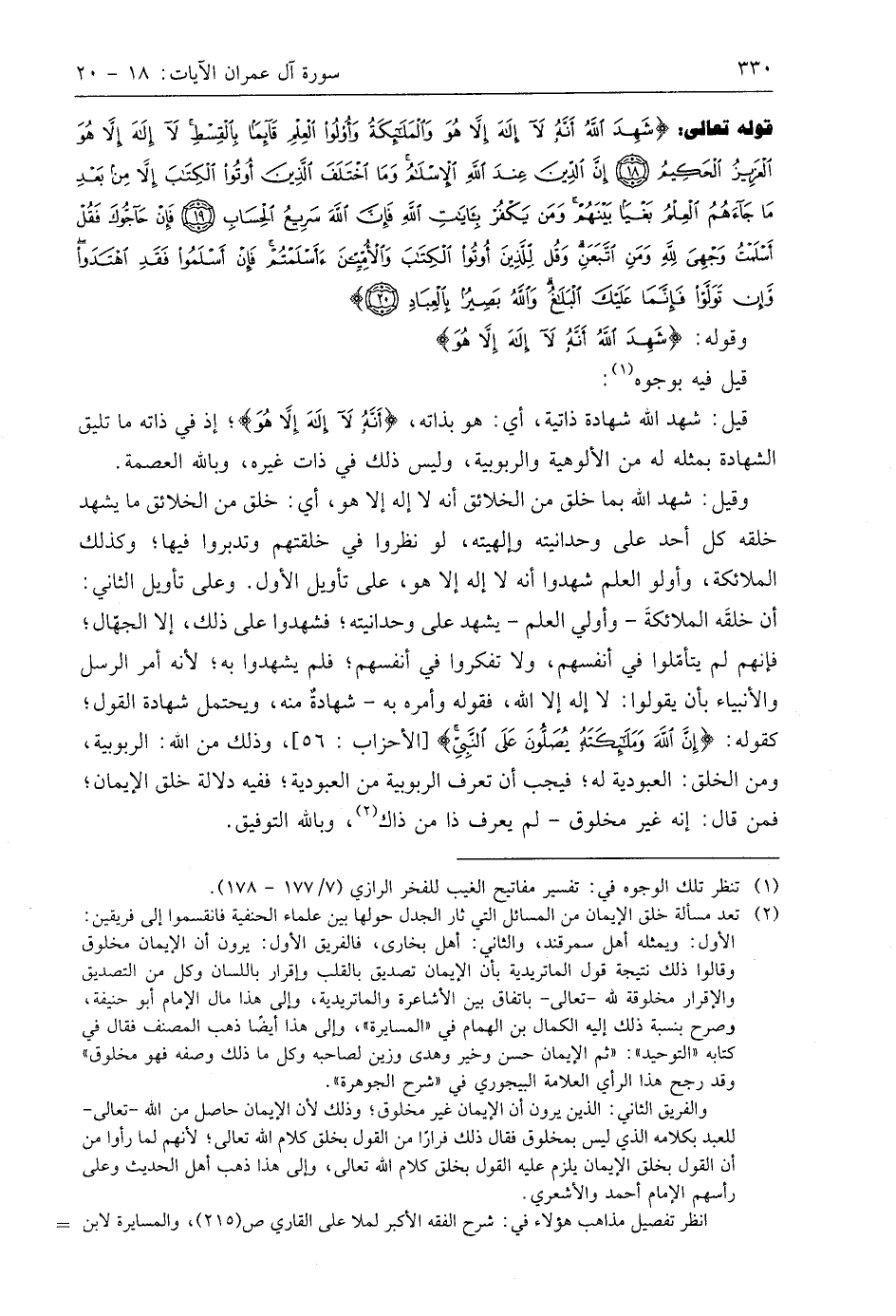 قوله تعالى: (شَهِدَ اللَّهُ أَنَّهُ لَا إِلَهَ إِلَّا هُوَ وَالْمَلَائِكَةُ وَأُولُو الْعِلْمِ قَائِمًا بِالْقِسْطِ لَا إِلَهَ إِلَّا هُوَ الْعَزِيزُ الْحَكِيمُ (18) إِنَّ الدِّينَ عِنْدَ اللَّهِ الْإِسْلَامُ وَمَا اخْتَلَفَ الَّذِينَ أُوتُوا الْكِتَابَ إِلَّا مِنْ بَعْدِ مَا جَاءَهُمُ الْعِلْمُ بَغْيًا بَيْنَهُمْ وَمَنْ يَكْفُرْ بِآيَاتِ اللَّهِ فَإِنَّ اللَّهَ سَرِيعُ الْحِسَابِ (19) فَإِنْ حَاجُّوكَ فَقُلْ أَسْلَمْتُ وَجْهِيَ لِلَّهِ وَمَنِ اتَّبَعَنِ وَقُلْ لِلَّذِينَ أُوتُوا الْكِتَابَ وَالْأُمِّيِّينَ أَأَسْلَمْتُمْ فَإِنْ أَسْلَمُوا فَقَدِ اهْتَدَوْا وَإِنْ تَوَلَّوْا فَإِنَّمَا عَلَيْكَ الْبَلَاغُ وَاللَّهُ بَصِيرٌ بِالْعِبَادِ (20)