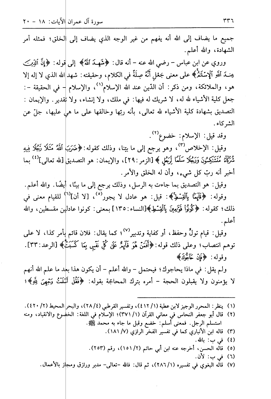 وروي عن ابن عَبَّاسٍ - رَضِيَ اللَّهُ عَنْهُ - أنه قال: (شَهِدَ اللَّهُ) إلى قوله: (إِنَّ الدِّينَ عِنْدَ اللَّهِ الْإِسْلَامُ) على معنى جَعْلِ (أَنَّهُ) صِلَة في الكلام، وحقيقته: شهد اللَّه الذي لا إله إلا هو، والملائكة، ومن ذكر: أن الدِّين عند اللَّه الإسلام، والإسلام في -الحقيقة-: جعل كلية الأشياء لله له، لا شريك له فيها: في ملك، ولا إنشاء، ولا تقدير. والإيمان: التصديق بشهادة كلية الأشياء لله تعالى، بأنه ربها وخالقها على ما عليها، جل عن الشركاء.