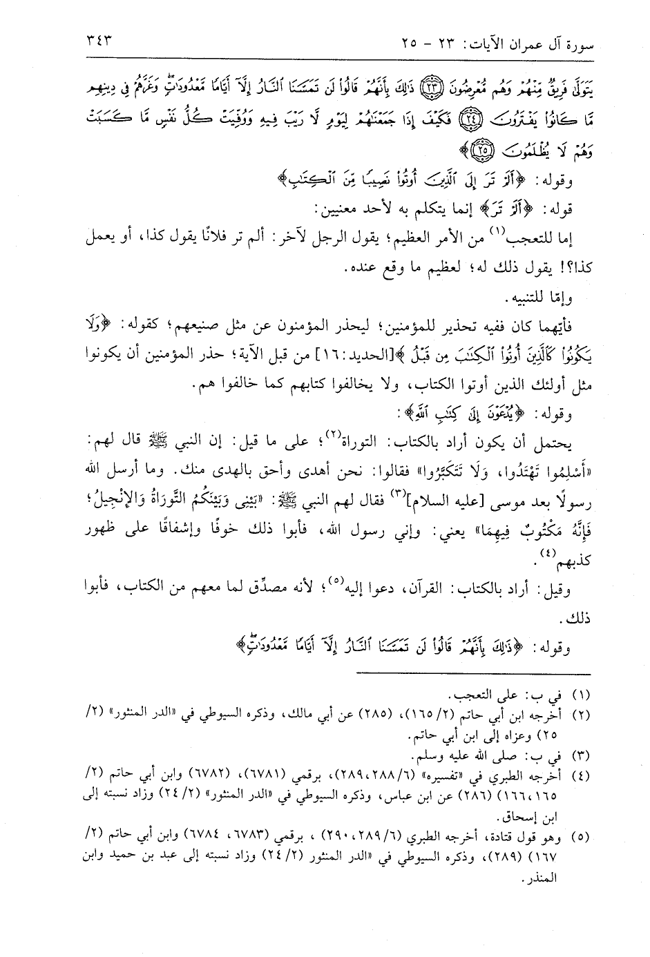 يَتَوَلَّى فَرِيقٌ مِنْهُمْ وَهُمْ مُعْرِضُونَ (23) ذَلِكَ بِأَنَّهُمْ قَالُوا لَنْ تَمَسَّنَا النَّارُ إِلَّا أَيَّامًا مَعْدُودَاتٍ وَغَرَّهُمْ فِي دِينِهِمْ مَا كَانُوا يَفْتَرُونَ (24) فَكَيْفَ إِذَا جَمَعْنَاهُمْ لِيَوْمٍ لَا رَيْبَ فِيهِ وَوُفِّيَتْ كُلُّ نَفْسٍ مَا كَسَبَتْ وَهُمْ لَا يُظْلَمُونَ (25)