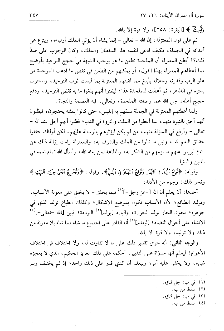 ثم على قول المعتزلة: إنّ اللَّه - تعالى - إنما يشاء أن يؤتي الملك أولياءه، وينزع عن أعدائه في الجملة، فكيف ادعى لنفسه هذا السلطان والملك، وكان الوجوب على ضدّ ذلك؟! أيظن المعتزلة أن الملحدة تطعن ما هو يوجب الشبهة في حجج التوحيد بأوضح مما أعطاهم المعتزلة بهذا القول، أو يمكنهم من الطعن في نقض ما ادعت الموحدة من علو الرب وقدرته وجلاله بأبلغ مما لقنتهم المعتزلة بما لبست ثوب التوحيد، واستترت بستره في الظاهر، ثم أعطت للملحدة هذا؛ ليظنوا أنهم بلغوا ما به نقض التوحيد، ودفع حجج أهله، جل اللَّه عما وصفته الملحدة، وتعالى، فبه العصمة والنجاة.
