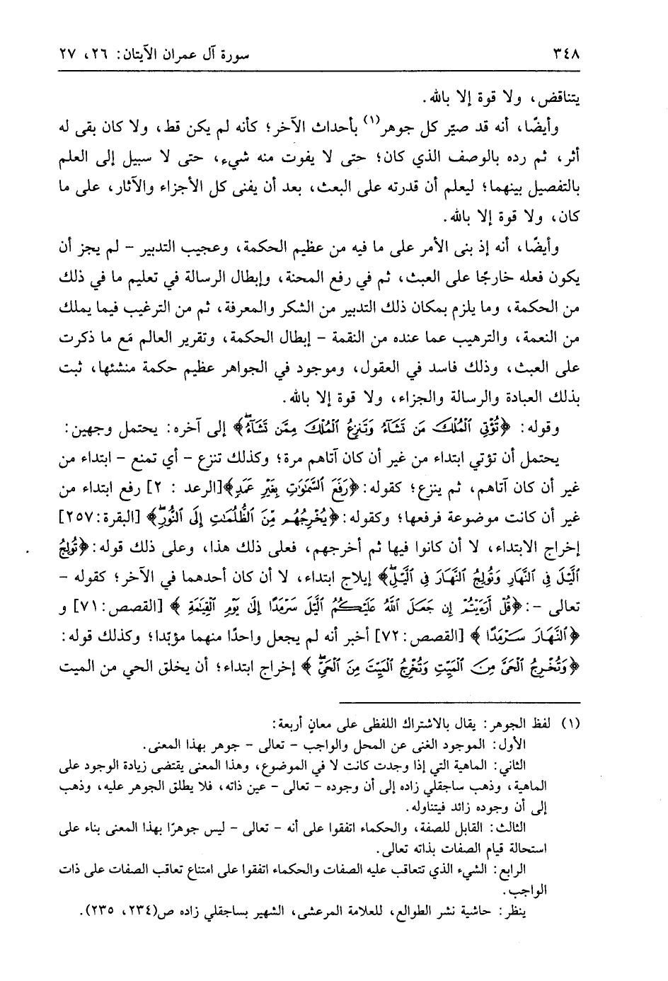 وقوله: (تُؤْتِي الْمُلْكَ مَنْ تَشَاءُ وَتَنْزِعُ الْمُلْكَ مِمَّنْ تَشَاءُ) إلى آخره: يحتمل وجهين: يحتمل أن تؤتي ابتداء من غير أن كان آتاهم مرة؛ وكذلك تنزع -أي تمنع- ابتداء من غير أن كان آتاهم، ثم ينزع؛ كقوله: (رَفَعَ السَّمَاوَاتِ بِغَيْرِ عَمَدٍ)، رفع ابتداء من غير أن كانت موضوعة فرفعها؛ وكقوله: (يُخْرِجُهُمْ مِنَ الظُّلُمَاتِ إِلَى النُّورِ)، إخراج الابتداء، لا أن كانوا فيها ثم أخرجهم، فعلى ذلك هذا، وعلى ذلك قوله: (تُولِجُ اللَّيْلَ فِي النَّهَارِ وَتُولِجُ النَّهَارَ فِي اللَّيْلِ) إيلاج ابتداء، لا أن كان أحدهما في الآخر؛ كقوله - تعالى -: (قُلْ أَرَأَيْتُمْ إِنْ جَعَلَ اللَّهُ عَلَيْكُمُ اللَّيْلَ سَرْمَدًا إِلَى يَوْمِ الْقِيَامَةِ)، و (النَّهَارَ سَرْمَدًا)، أخبر أنه لم يجعل واحدًا منهما مؤبدا؛ وكذلك قوله: (وَتُخْرِجُ الْحَيَّ مِنَ الْمَيِّتِ وَتُخْرِجُ الْمَيِّتَ مِنَ الْحَيِّ) إخراج ابتداء؛ أن يخلق الحي من الميت