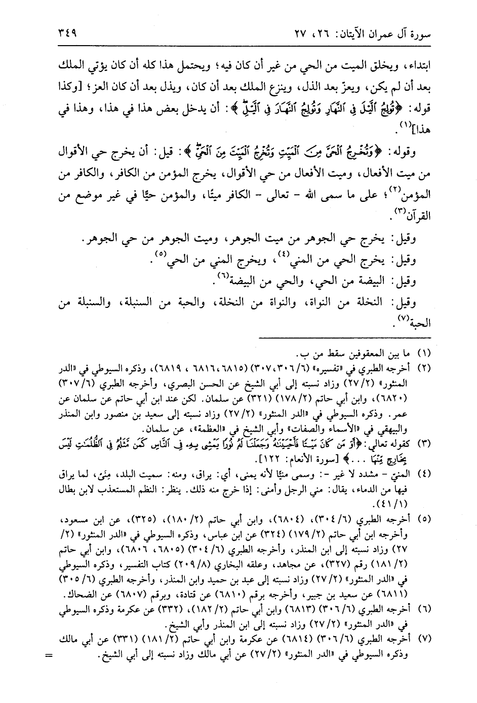 ابتداء، ويخلق الميت من الحي من غير أن كان فيه؛ ويحتمل هذا كله أن كان يؤتي الملك بعد أن لم يكن، ويعزّ بعد الذل، وينزع الملك بعد أن كان، ويذل بعد أن كان العز؛ وكذا قوله: (تُولِجُ اللَّيْلَ فِي النَّهَارِ وَتُولِجُ النَّهَارَ فِي اللَّيْلِ (27) أن يدخل بعض هذا في هذا، وهذا في هذا.