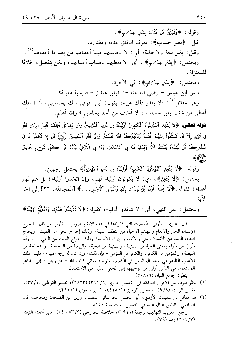 ويحتمل: (بِغَيْرِ حِسَابٍ)، أي: لا يعطيهم بحساب أعمالهم، ولكن بتفضل، خلافًا للمعتزلة.