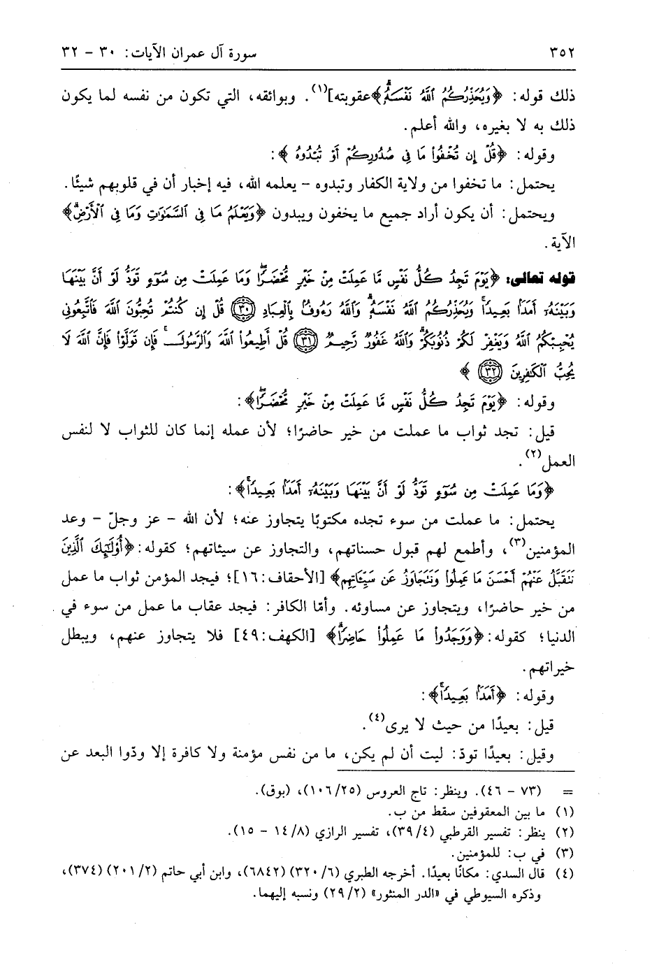 قوله تعالى: (يَوْمَ تَجِدُ كُلُّ نَفْسٍ مَا عَمِلَتْ مِنْ خَيْرٍ مُحْضَرًا وَمَا عَمِلَتْ مِنْ سُوءٍ تَوَدُّ لَوْ أَنَّ بَيْنَهَا وَبَيْنَهُ أَمَدًا بَعِيدًا وَيُحَذِّرُكُمُ اللَّهُ نَفْسَهُ وَاللَّهُ رَءُوفٌ بِالْعِبَادِ (30) قُلْ إِنْ كُنْتُمْ تُحِبُّونَ اللَّهَ فَاتَّبِعُونِي يُحْبِبْكُمُ اللَّهُ وَيَغْفِرْ لَكُمْ ذُنُوبَكُمْ وَاللَّهُ غَفُورٌ رَحِيمٌ (31) قُلْ أَطِيعُوا اللَّهَ وَالرَّسُولَ فَإِنْ تَوَلَّوْا فَإِنَّ اللَّهَ لَا يُحِبُّ الْكَافِرِينَ (32)