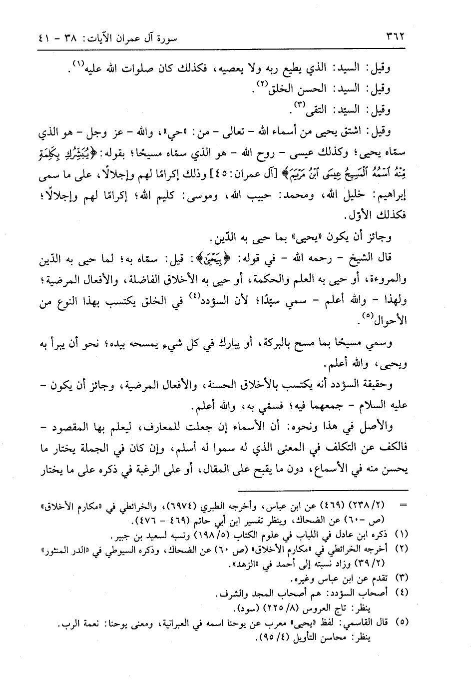 قال الشيخ - رحمه اللَّه - في قوله: (بِيَحْيَى): قيل: سماه به؛ لما حيي به الدِّين والمروءة، أو حيي به العلم والحكمة، أو حيي به الأخلاق الفاضلة، والأفعال المرضية؛ ولهذا - واللَّه أعلم - سمي سيدًا؛ لأن السؤدد في الخلق يكتسب بهذا النوع من الأحوال.