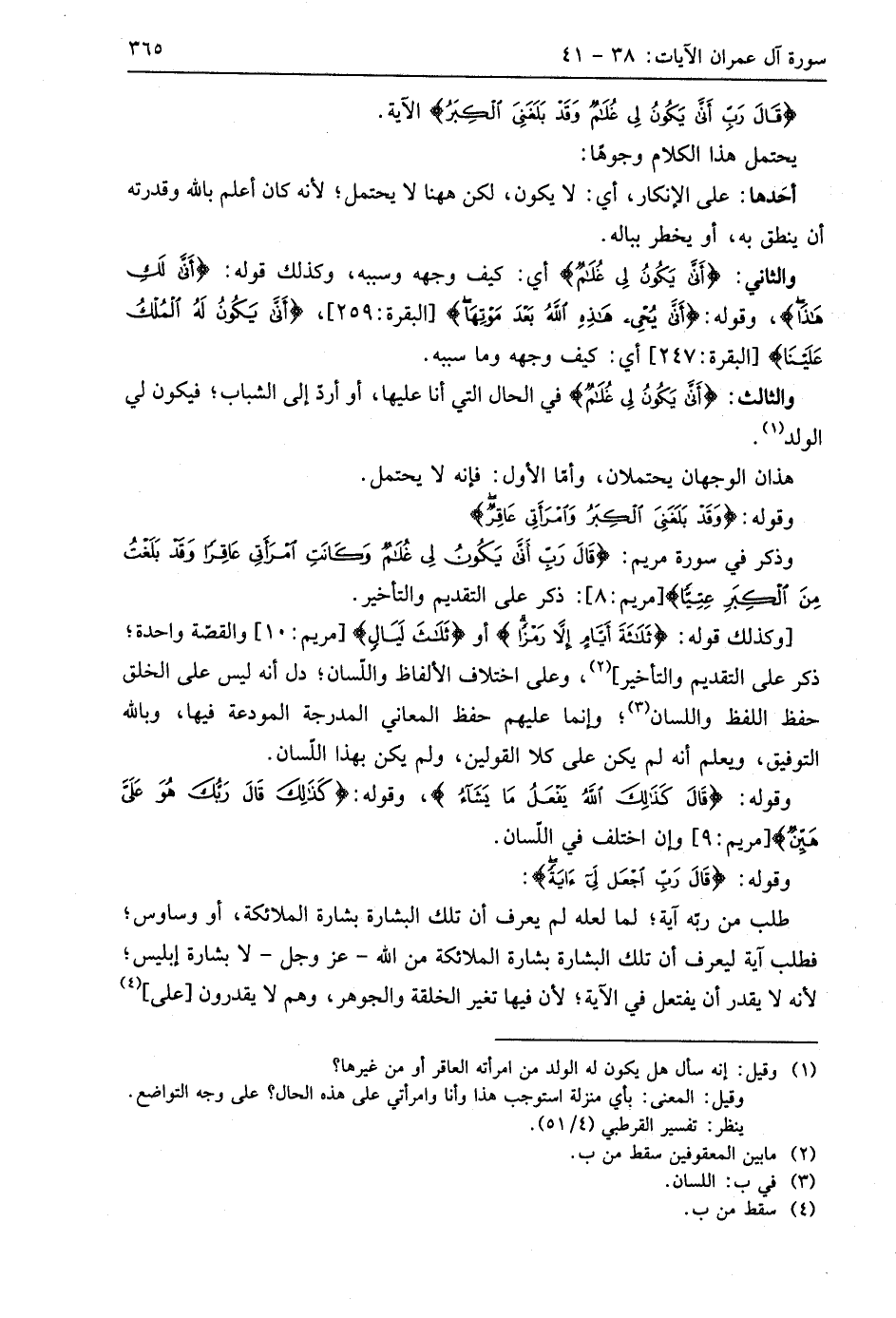 وكذلك قوله: (ثَلَاثَةَ أَيَّامٍ إِلَّا رَمْزًا) أو (ثَلَاثَ لَيَالٍ)، والقصة واحدة؛ ذكر على التقديم والتأخير، وعلى اختلاف الألفاظ واللسان؛ دل أنه ليس على الخلق حفظ اللفظ واللسان؛ وإنما عليهم حفظ المعاني المدرجة المودعة فيها، وبالله التوفيق، ويعلم أنه لم يكن على كلا القولين، ولم يكن بهذا اللسان.