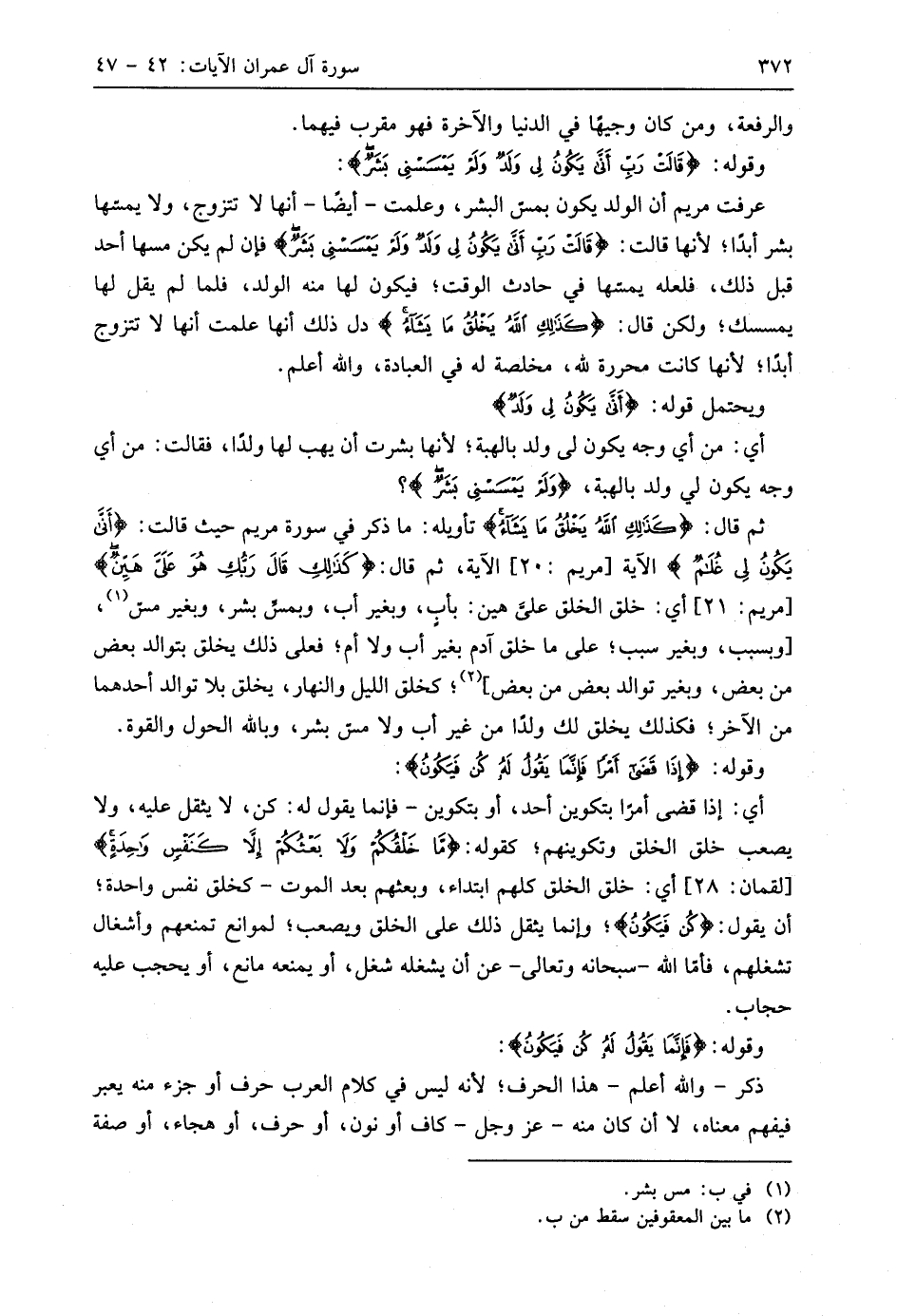 وقوله: (قَالَتْ رَبِّ أَنَّى يَكُونُ لِي وَلَدٌ وَلَمْ يَمْسَسْنِي بَشَرٌ (47)