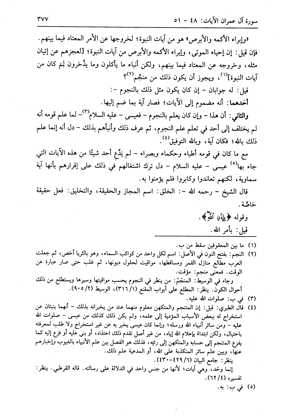 وإبراء الأكمه والأبرص " هو من آيات النبوة؛ لخروجها عن الأمر المعتاد فيما بينهم. فَإِنْ قِيلَ: إن إحياء الموتى، وإبراء الأكمه والأبرص من آيات النبوة؛ لعجزهم عن إتيان مثله، وخروجه عن المعتاد فيما بينهم، ولكن أنباء ما يأكلون وما يدخرون لِمَ كان من آيات النبوة، ويجوز أن يكون ذلك من منجم؟