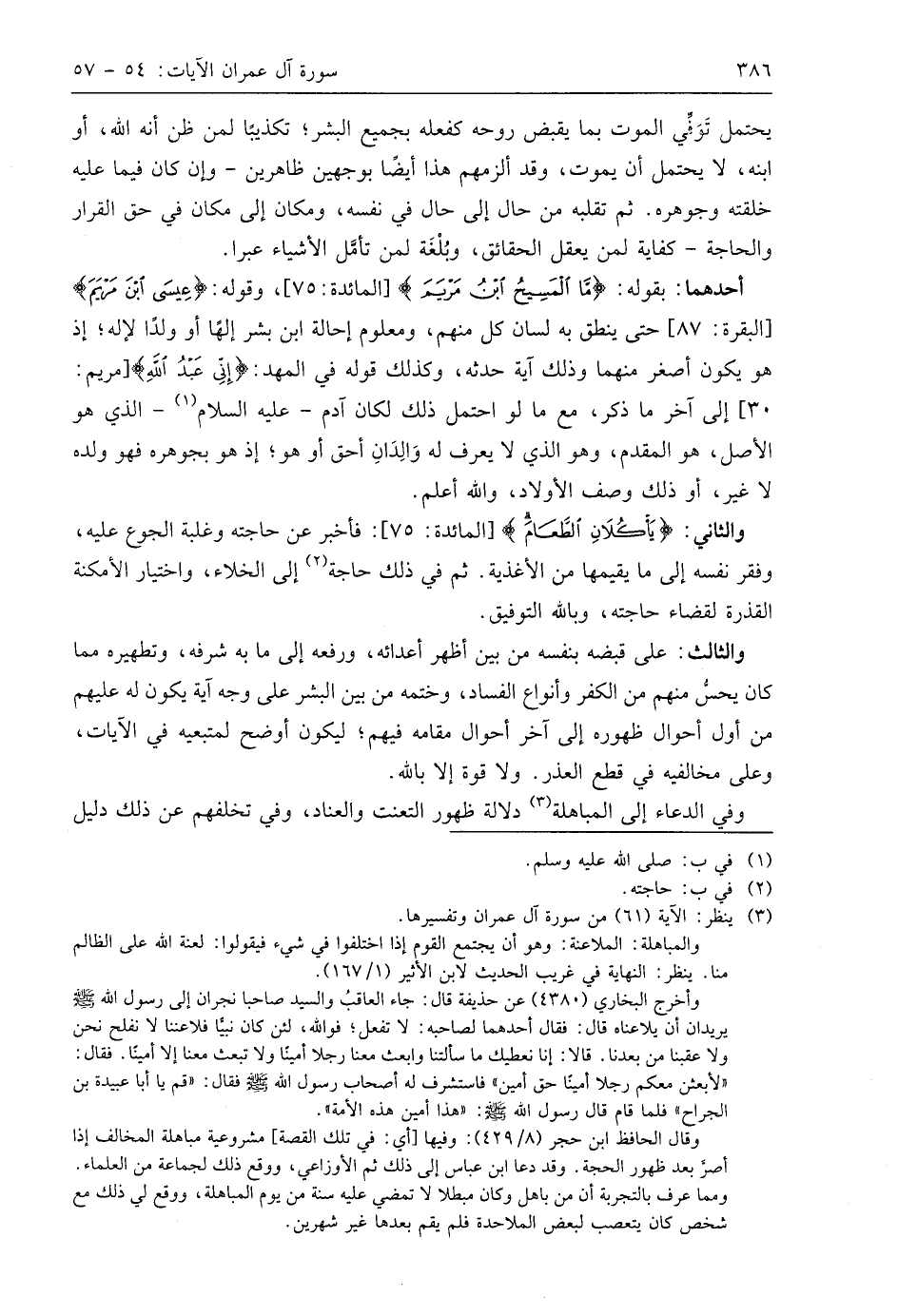 أحدهما: بقوله: (مَا الْمَسِيحُ ابْنُ مَرْيَمَ)، وقوله: (عِيسَى ابْنُ مَرْيَمَ) حتى ينطق به لسان كل منهم، ومعلوم إحالة ابن بشر إلهًا أو ولدًا لإله؛ إذ هو يكون أصغر منهما وذلك آية حدثه، وكذلك قوله في المهد: (إِنِّي عَبْدُ اللَّهِ): إلى آخر ما ذكر، مع ما لو احتمل ذلك لكان آدم - عليه السلام - الذي هو الأصل، هو المقدم، وهو الذي لا يعرف له وَالِدَانِ أحق أو هو؟ إذ هو بجوهره فهو ولده لا غير، أو ذلك وصف الأولاد، واللَّه أعلم.