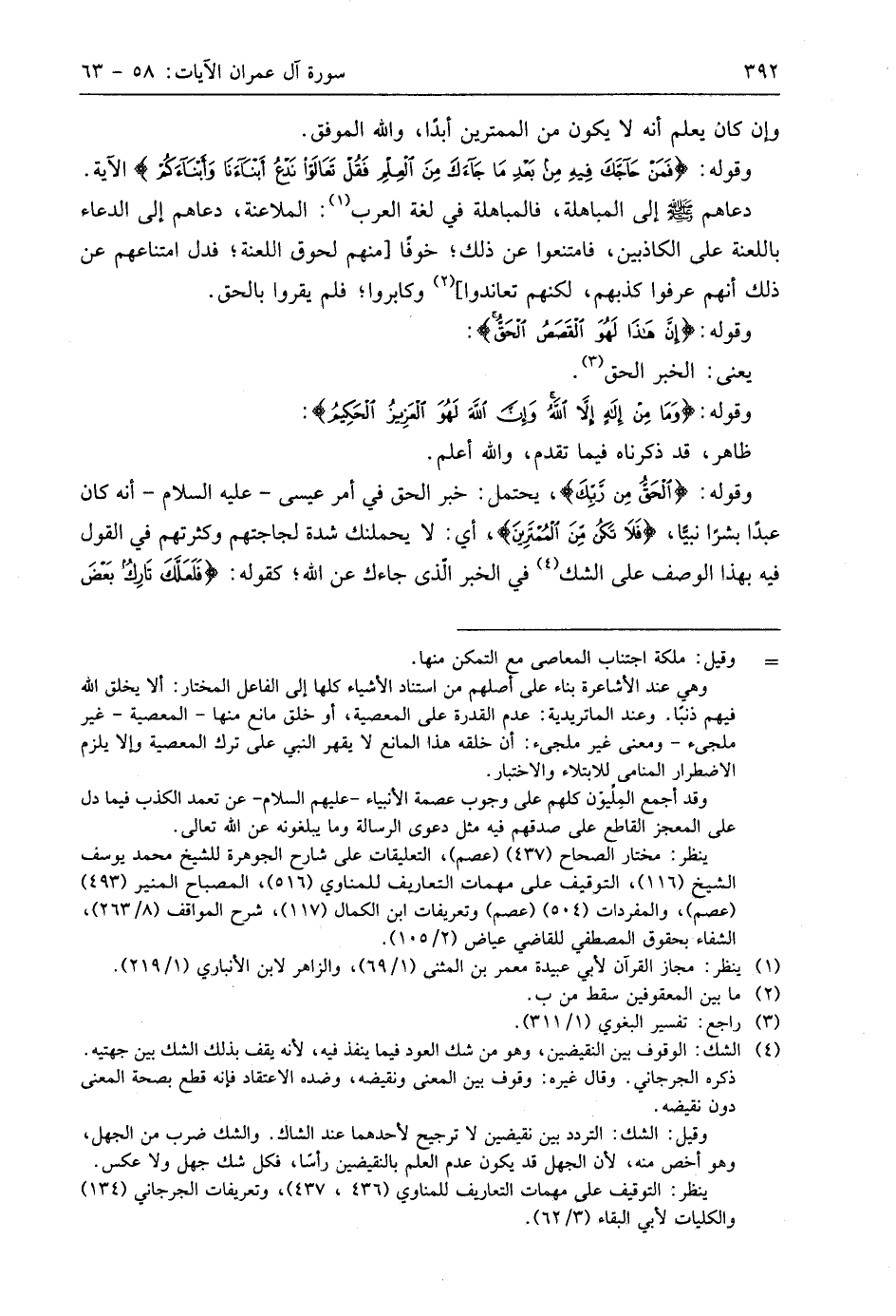 دعاهم - صَلَّى اللَّهُ عَلَيهِ وَسَلَّمَ - إلى المباهلة، فالمباهلة في لغة العرب: الملاعنة، دعاهم إلى الدعاء باللعنة على الكاذبين، فامتنعوا عن ذلك؛ خوفًا منهم لحوق اللعنة؛ فدل امتناعهم عن ذلك أنهم عرفوا كذبهم، لكنهم تعاندوا، وكابروا؛ فلم يقروا بالحق.