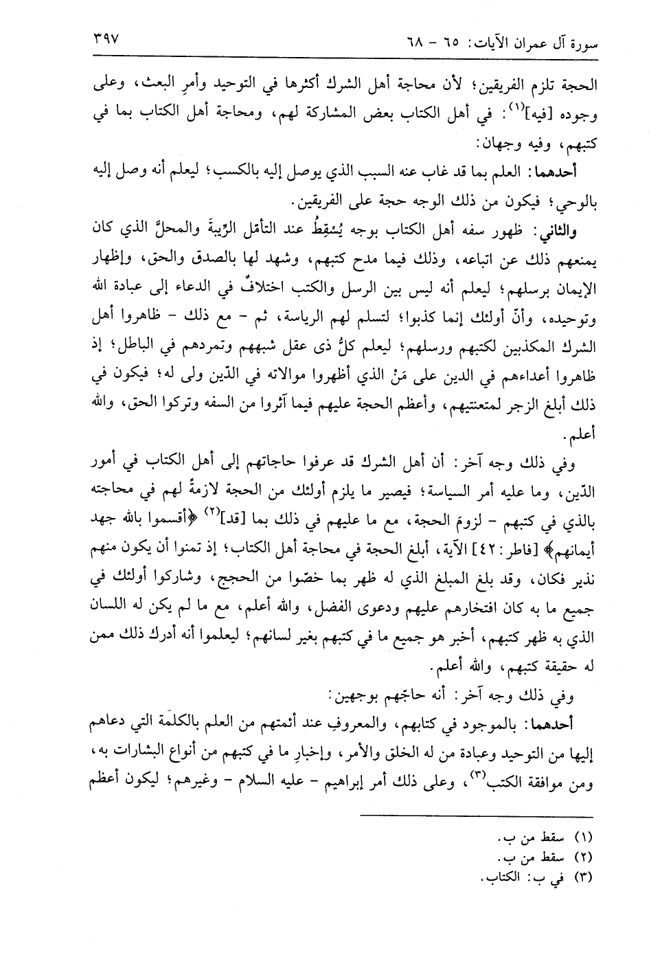 والثاني: ظهور سفه أهل الكتاب بوجه يُسقِطُ عند التأمل الريبةَ والمحلَّ الذي كان يمنعهم ذلك عن اتباعه، وذلك فيما مدح كتبهم، وشهد لها بالصدق والحق، وإظهار الإيمان برسلهم؛ ليعلم أنه ليس بين الرسل والكتب اختلاف في الدعاء إلى عبادة الله وتوحيده، وأن أُولَئِكَ إنما كذبوا؛ لتسلم لهم الرياسة، ثم -مع ذلك- ظاهروا أهل الشرك المكذبين لكتبهم ورسلهم؛ ليعلم كلُّ ذي عقل شبههم وتمردهم في الباطل؛ إذ ظاهروا أعداءهم في الدِّين على مَنْ الذي أظهروا موالاته في الدِّين ولى له؛ فيكون في ذلك أبلغ الزجر لمتعنتيهم، وأعظم الحجة عليهم فيما آثروا من السفه وتركوا الحق، والله أعلم.