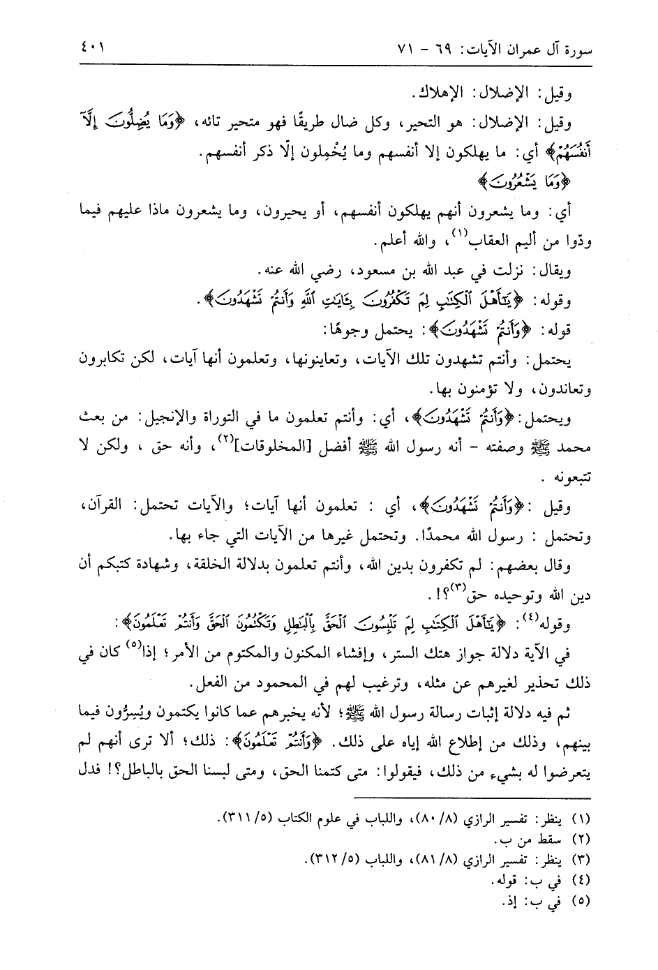 وقوله: (يَا أَهْلَ الْكِتَابِ لِمَ تَكْفُرُونَ بِآيَاتِ اللَّهِ وَأَنْتُمْ تَشْهَدُونَ (70)
