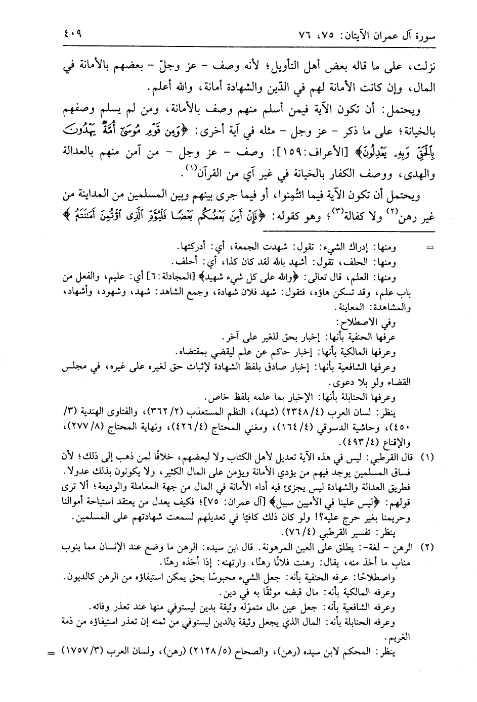 نزلت، على ما قاله بعض أهل التأويل؛ لأنه وصف - عَزَّ وَجَلَّ - بعضهم بالأمانة في المال، وإن كانت الأمانة لهم في الذين والشهادة أمانة، واللَّه أعلم.