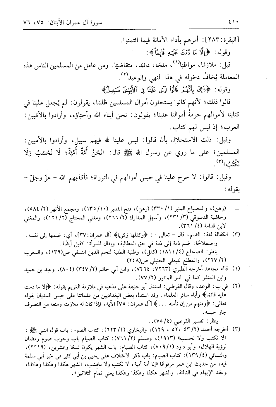 قالوا ذلك؛ لأنهم كانوا يستحلون أموال المسلمين ظلمًا، يقولون: لم يُجعل علينا في كتابنا لأموالهم حرمةُ أموالنا علينا؛ يقولون: نحن أبناء اللَّه وأحباؤه، وأرادوا بالأمّيين: العرب؛ إذ ليس لهم كتاب.