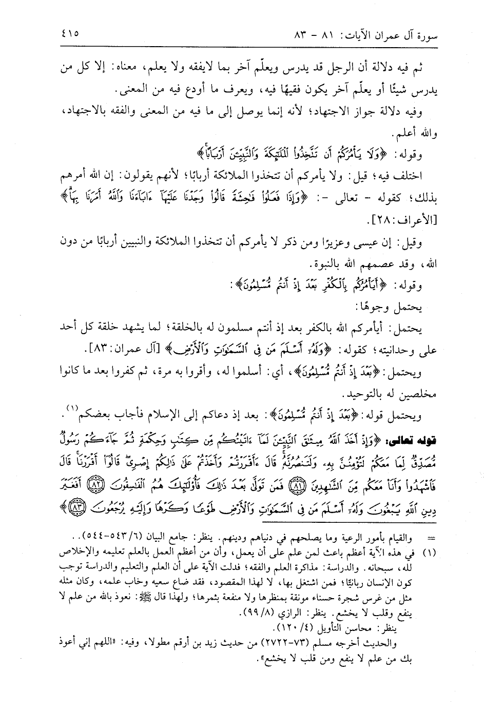 وقوله: (وَلَا يَأْمُرَكُمْ أَنْ تَتَّخِذُوا الْمَلَائِكَةَ وَالنَّبِيِّينَ أَرْبَابًا أَيَأْمُرُكُمْ بِالْكُفْرِ بَعْدَ إِذْ أَنْتُمْ مُسْلِمُونَ (80)