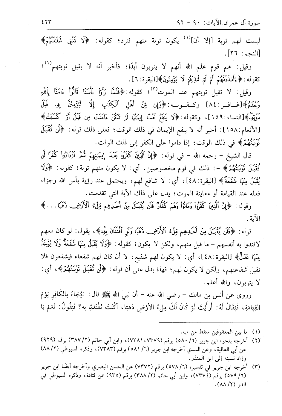 وقوله: (إِنَّ الَّذِينَ كَفَرُوا وَمَاتُوا وَهُمْ كُفَّارٌ فَلَنْ يُقْبَلَ مِنْ أَحَدِهِمْ مِلْءُ الْأَرْضِ ذَهَبًا (91) الآية.