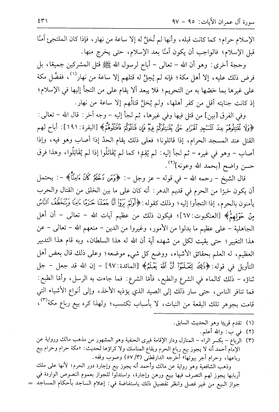 قال الشيخ - رحمه اللَّه - في قوله - عَزَّ وَجَلَّ -: (وَمَنْ دَخَلَهُ كَانَ آمِنًا) -: يحتمل أن يكون خبرًا من الحرم في قديم الدهر: أنه كان على ما بين الخلق من القتال والحرب يأمنون بالحرم، إذا التجأوا إليه؛ وذلك كقوله: (أَوَلَمْ يَرَوْا أَنَّا جَعَلْنَا حَرَمًا آمِنًا وَيُتَخَطَّفُ النَّاسُ مِنْ حَوْلِهِمْ)؛ فيكون ذلك من عظيم آيات اللَّه - تعالى - أن أهل الجاهلية - على عظيم ما بدلوا من الأمور، وغيروا من الدِّين - منعهم اللَّه - تعالى - عن هذا التغيير؛ حتى بقيت لكل من شهده آية أن اللَّه له هذا السلطان، وبه قام هذا التدبير العظيم، له العلم بحقائق الأشياء، ووضع كل شيء موضعه؛ وعلى ذلك قال بعض أهل التأويل في قوله: (ذَلِكَ لِتَعْلَمُوا أَنَّ اللَّهَ يَعْلَمُ) - إن اللَّه قد جعل - جل ثناؤه - ذلك كالماء في الشرع والطبع، فأمّا الشرع: فما جاءت به الرسل، وأمّا الطبع: فما تنافر الناس، حتى سار ذلك إلى الصيد الذي يؤذيه الأخذ، وإلى أنواع الأشياء التي قامت بجوهر تلك البقعة من النبات، لا بأسباب تكتسب؛ ولهذا كره بيع رباع مكة،