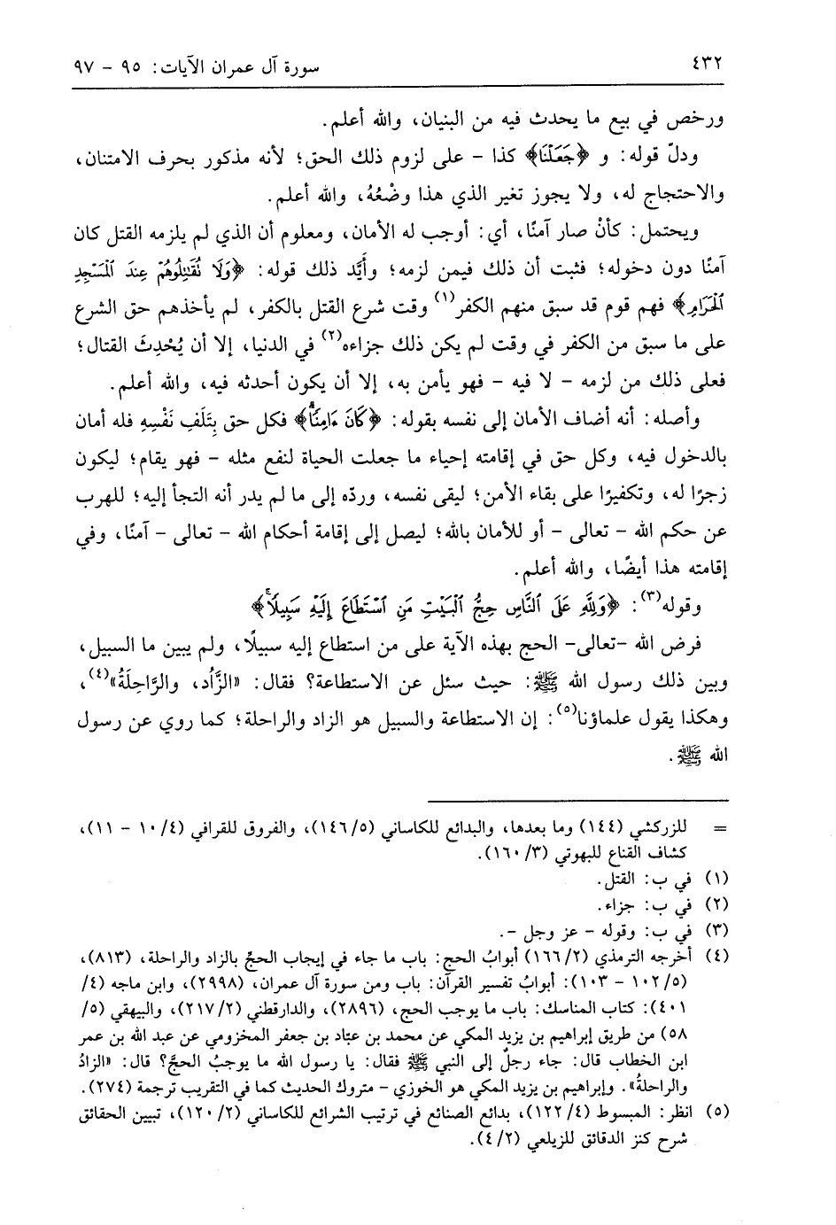 فرض اللَّه - تعالى - الحج بهذه الآية على من استطاع إليه سبيلًا، ولم يبين ما السبيل، وبين ذلك رسول اللَّه - صَلَّى اللَّهُ عَلَيهِ وَسَلَّمَ -: حيث سئل عن الاستطاعة؛ فقال: " الزَّاد، والراحِلَةُ "، وهكذا يقول علماؤنا: إن الاستطاعة والسبيل هو الزاد والراحلة؛ كما روي عن رسول اللَّه - صَلَّى اللَّهُ عَلَيهِ وَسَلَّمَ -