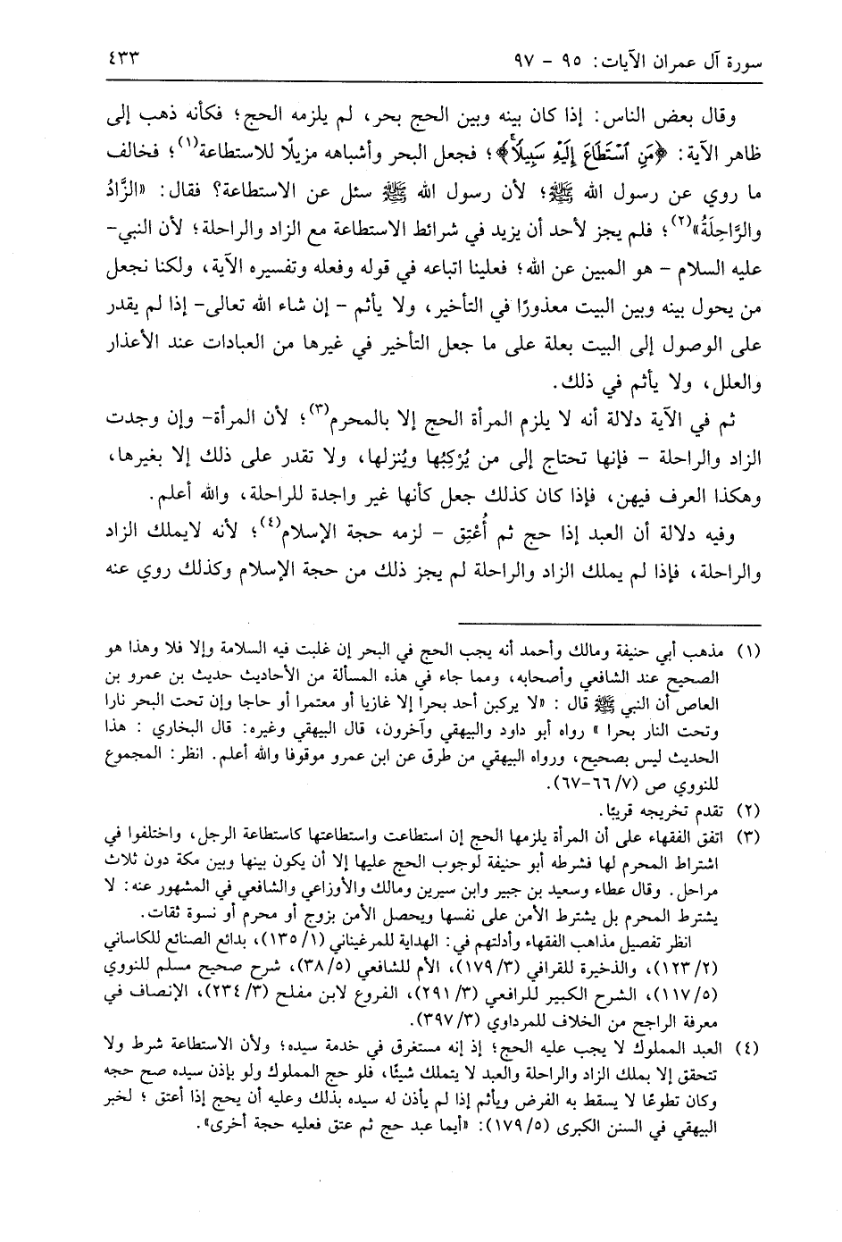 ثم في الآية دلالة أنه لا يلزم المرأة الحج إلا بالمحرم؛ لأن المرأة -وإن وجدت الزاد والراحلة- فإنها تحتاج إلى من يُركِبُها ويُنزلها، ولا تقدر على ذلك إلا بغيرها، وهكذا العرف فيهن، فإذا كان كذلك جعل كأنها غير واجدة للراحلة، واللَّه أعلم.