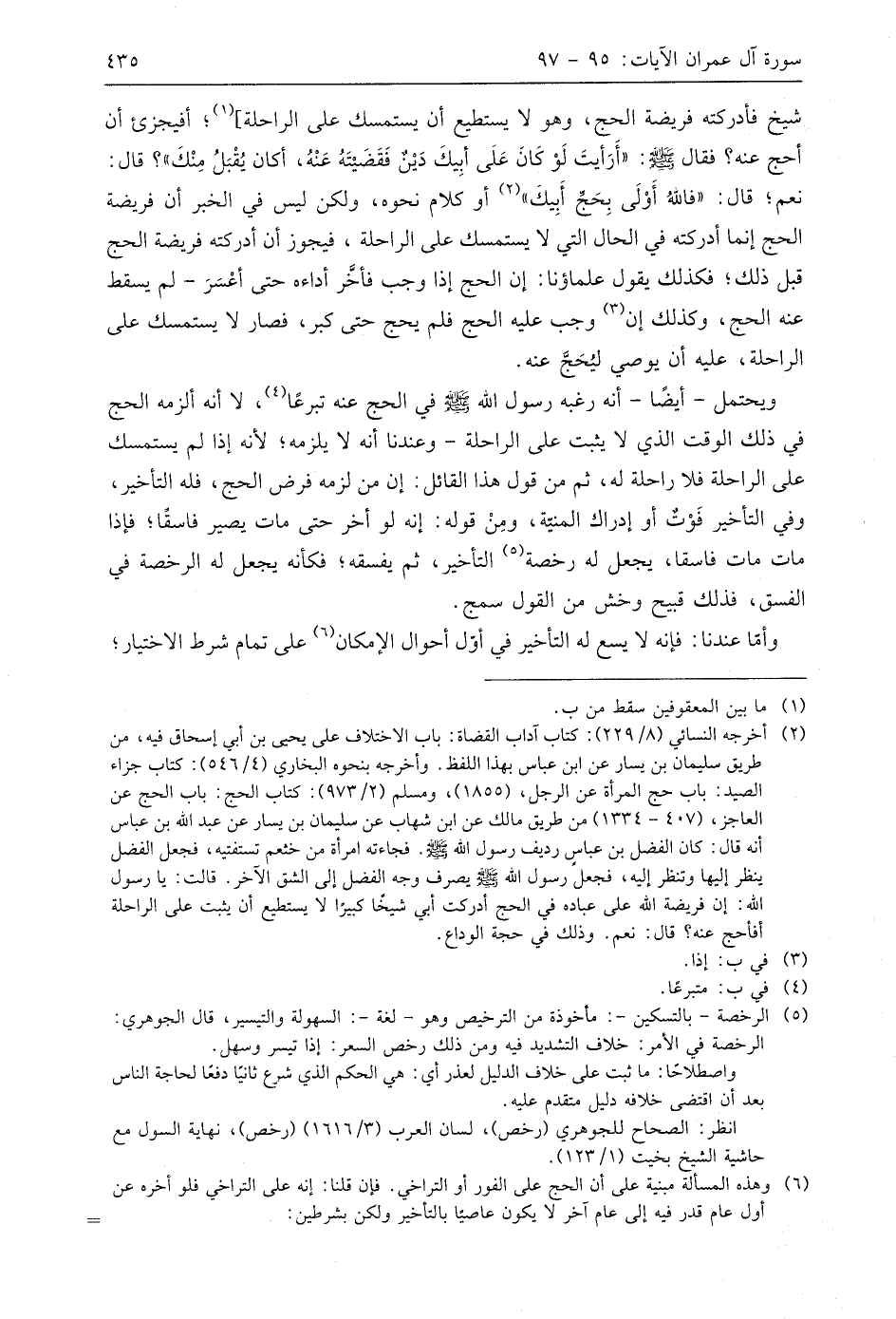 شيخ فأدركته فريضة الحج، وهو لا يستطيع أن يستمسك على الراحلة؛ أفيجزئ أن أحج عنه؟ فقال - صَلَّى اللَّهُ عَلَيهِ وَسَلَّمَ -: " أَرَأيتَ لَوْ كَانَ عَلَى أبِيكَ دَيْن فَقَضَيتَهُ عَنْهُ، أكان يُقْبَلُ مِنْكَ "؟ قال: نعم؛ قال: " فاللهُ أَوْلَى بِحَج أَبِيكَ " أو كلام نحوه، ولكن ليس في الخبر أن فريضة الحج إنما أدركته في الحال التي لا يستمسك على الراحلة، فيجوز أن أدركته فريضة الحج قبل ذلك؛ فكذلك يقول علماؤنا: إن الحج إذا وجب فأخر أداءه حتى أعْسَرَ - لم يسقط عنه الحج، وكذلك إن وجب عليه الحج فلم يحج حتى كبر، فصار لا يستمسك على الراحلة، عليه أن يوصي ليُحَجَّ عنه.