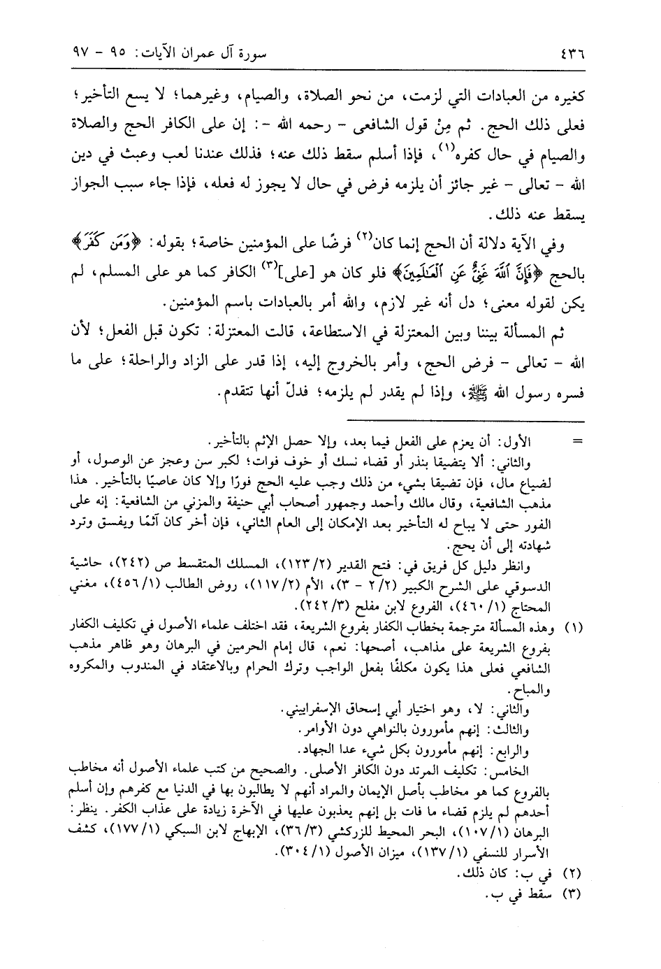 كغيره من العبادات التي لزمت، من نحو الصلاة، والصيام، وغيرهما؛ لا يسع التأخير؛ فعلى ذلك الحج. ثم مِنْ قول الشافعي - رحمه اللَّه -: إن على الكافر الحج والصلاة والصيام في حال كفره، فإذا أسلم سقط ذلك عنه؛ فذلك عندنا لعب وعبث في دين اللَّه - تعالى - غير جائز أن يلزمه فرض في حال لا يجوز له فعله، فإذا جاء سبب الجواز يسقط عنه ذلك.