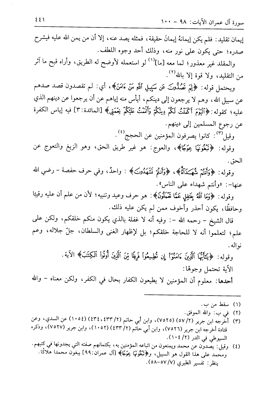وقوله: (يَا أَيُّهَا الَّذِينَ آمَنُوا إِنْ تُطِيعُوا فَرِيقًا مِنَ الَّذِينَ أُوتُوا الْكِتَابَ (100)