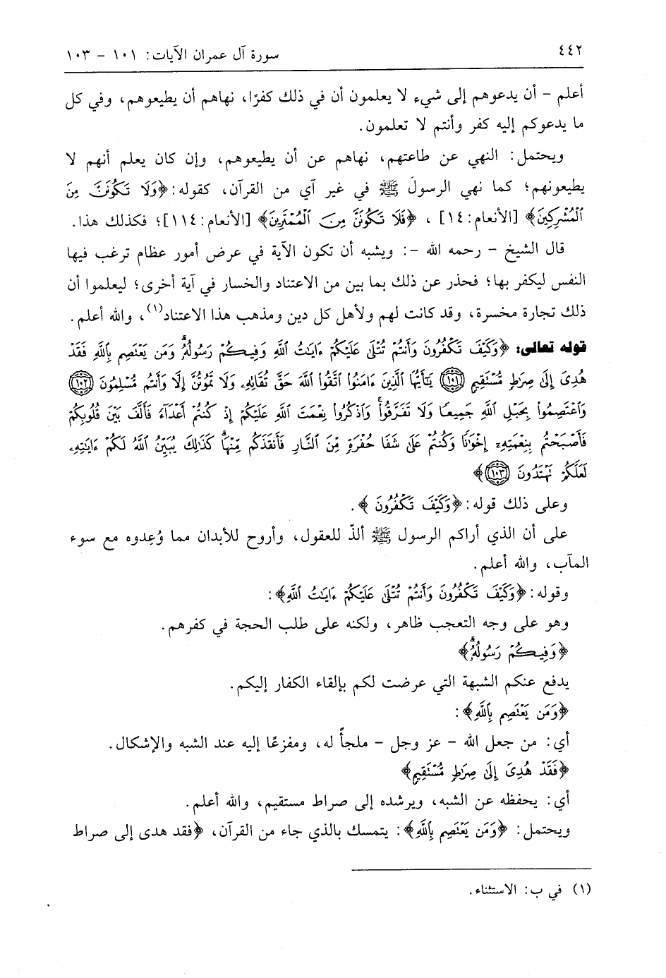 قوله تعالى: (وَكَيْفَ تَكْفُرُونَ وَأَنْتُمْ تُتْلَى عَلَيْكُمْ آيَاتُ اللَّهِ وَفِيكُمْ رَسُولُهُ وَمَنْ يَعْتَصِمْ بِاللَّهِ فَقَدْ هُدِيَ إِلَى صِرَاطٍ مُسْتَقِيمٍ (101) يَا أَيُّهَا الَّذِينَ آمَنُوا اتَّقُوا اللَّهَ حَقَّ تُقَاتِهِ وَلَا تَمُوتُنَّ إِلَّا وَأَنْتُمْ مُسْلِمُونَ (102) وَاعْتَصِمُوا بِحَبْلِ اللَّهِ جَمِيعًا وَلَا تَفَرَّقُوا وَاذْكُرُوا نِعْمَتَ اللَّهِ عَلَيْكُمْ إِذْ كُنْتُمْ أَعْدَاءً فَأَلَّفَ بَيْنَ قُلُوبِكُمْ فَأَصْبَحْتُمْ بِنِعْمَتِهِ إِخْوَانًا وَكُنْتُمْ عَلَى شَفَا حُفْرَةٍ مِنَ النَّارِ فَأَنْقَذَكُمْ مِنْهَا كَذَلِكَ يُبَيِّنُ اللَّهُ لَكُمْ آيَاتِهِ لَعَلَّكُمْ تَهْتَدُونَ (103)