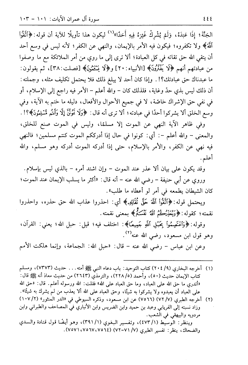 الجَنَّةَ؛ إِذَا عَبَدَهُ، وَلَمْ يُشْرِكْ غَيرَهُ فِيهِ أَحَدًا " ليكون هذا تأويلًا للآية أن قوله: (اتَّقُوا اللَّهَ) ولا تكفروه؛ فيكون فيه الأمر بالإيمان، والنهي عن الكفر؛ لأنه ليس في وسع أحد أن يتقي اللَّه حق تقاته في كل العبادة؛ ألا ترى إلى ما روي من أمر الملائكة مع ما وصفوا من عبادتهم أنهم (لَا يَفتُرُونَ)، و (لَا يَسْأَمُونَ)، ثم يقولون: ما عبدناك حق عبادتك؟!. وإذا كان أحد لا يبلغ ذلك فلا يحتمل تكليف مثله، وجملته: أن ذلك ليس بذي حدّ وغاية، فلذلك كان - واللَّه أعلم - الأمر فيه راجع إلى الإسلام، أو في نفي حق الإشراك خاصة، لا في جميع الأحوال والأفعال، دليله ما ختم به الآية، وفي وسع الخلق ألا يشركوا أحدًا في عبادته؛ ألا ترى أنه قال: (وَلَا تَمُوتُنَّ إِلَّا وَأَنْتُمْ مُسْلِمُونَ)؟!.