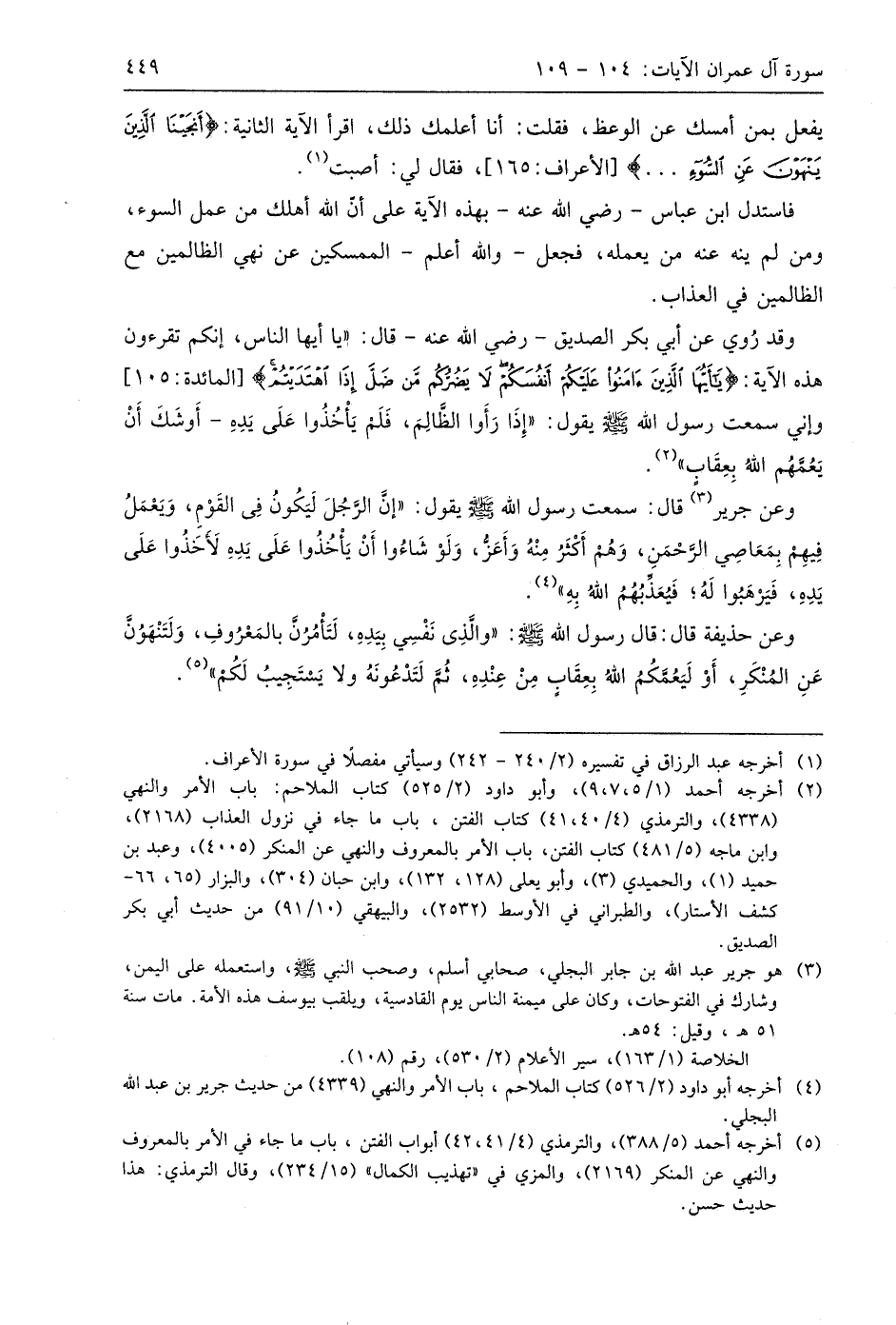 وعن جرير قال: سمعت رسول اللَّه - صَلَّى اللَّهُ عَلَيهِ وَسَلَّمَ - يقول: " إن الرجُلَ لَيَكُونُ فِي القَوْمِ، وَيَعْمَلُ فِيهِم بِمَعَاصِي الرحْمَنِ، وَهُم أكْثَرُ مِنْهُ وَأَعَزُّ، وَلَو شَاءُوا أَنْ يَأْخُذُوا عَلَى يَدِهِ لَأَخَذُوا عَلَى يَدِهِ، فَيَرْهَبُوا لَهُ؛ فَيُعَذّبُهُمُ اللهُ بِهِ ".