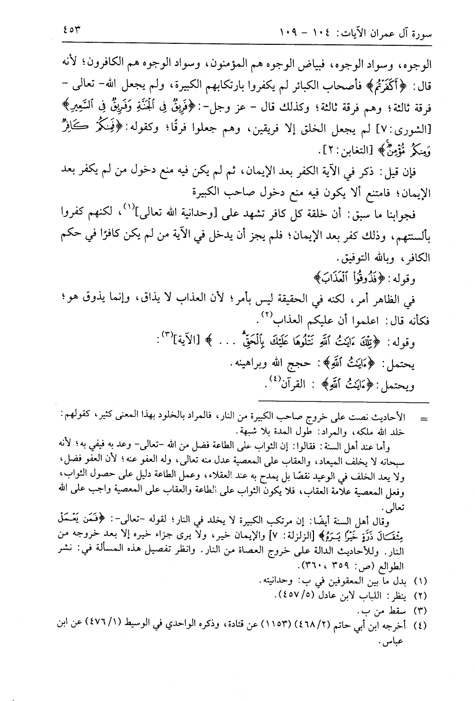 الوجوه، وسواد الوجوه، فبياض الوجوه هم المؤمنون، وسواد الوجوه هم الكافرون؛ لأنه قال: (أَكَفَرْتُم) فأصحاب الكبائر لم يكفروا بارتكابهم الكبيرة، ولم يجعل اللَّه - تعالى - فرقة ثالثة؛ وهم فرقة ثالثة؛ وكذلك قال - عَزَّ وَجَلَّ -: (فَرِيقٌ فِي الْجَنَّةِ وَفَرِيقٌ فِي السَّعِيرِ) لم يجعل الخلق إلا فريقين، وهم جعلوا فرقًا؛ وكقوله: (فَمِنْكُمْ كَافِرٌ وَمِنْكُمْ مُؤْمِنٌ).