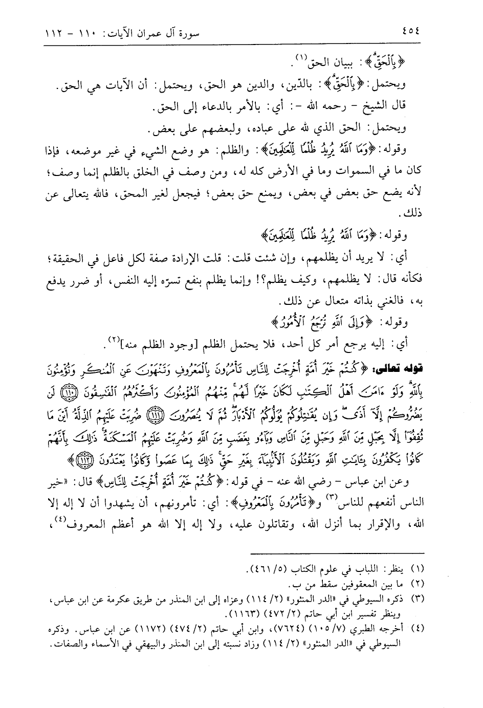 وعن ابن عَبَّاسٍ - رَضِيَ اللَّهُ عَنْهُ - في قوله: (كُنْتُمْ خَيْرَ أُمَّةٍ أُخْرِجَتْ لِلنَّاسِ) وقال: " خير الناس أنفعهم للناس و (تَأْمُرُونَ بِالْمَعْرُوفِ): أي: تأمرونهم، أن يشهدوا أن لا إله إلا اللَّه، والإقرار بما أنزل اللَّه، وتقاتلون عليه، ولَا إِلَهَ إِلَّا اللَّهُ هو أعظم المعروف،