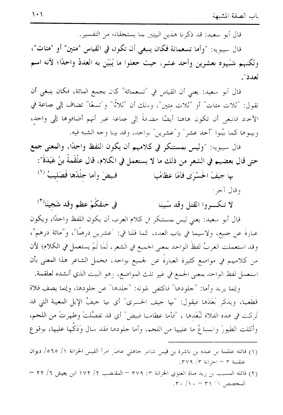 قال أبو سعيد: يعني ليس بمستنكر في كلام العرب أن يكون اللفظ واحدا، ويكون عبارة عن جميع، ولا سيما في باب العدد، كما قلنا في: " عشرين درهما "، و " مائة درهم "، وقد استعملت العرب لفظ الواحد بمعنى الجميع في الشعر، لمّا لم يستعمل في الكلام؛ لأن من كلامهم في مواضع كثيرة العبارة عن الجميع بواحد، فحمل الشاعر هذا المعنى بأن استعمل لفظ الواحد بمعنى الجمع في غير تلك المواضع، وهو البيت الذي أنشده لعلقمة.
