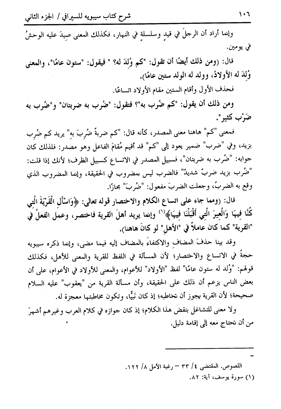 وقد بينا حذف المضاف والاكتفاء بالمضاف إليه فيما مضى، وإنما ذكره سيبويه حجة في الاتساع والاختصار؛ لأن المسألة في اللفظ للقرية والمعنى للأهل، فكذلك قولهم: " ولد له ستون عاما " لفظ " الأولاد " للأعوام، والمعنى للأولاد في الأعوام، على أن بعض الناس يزعم أن ذلك على الحقيقة، وأن مسألة القرية من " يعقوب " عليه السّلام صحيحة؛ لأن القرية يجوز أن تخاطبه؛ إذ كان نبيّا، وتكون مخاطبتها معجزة له.
