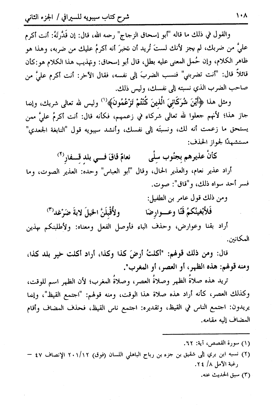 ومثل هذا أَيْنَ شُرَكائِيَ الَّذِينَ كُنْتُمْ تَزْعُمُونَ (¬1) وليس لله تعالى شريك، وإنما جاز هذا؛ لأنهم جعلوا لله تعالى شركاء في زعمهم، فكأنه قال: أنت أكرم عليّ ممن يستحق ما زعمت أنه لك، ونسبته إلى نفسك، وأنشد سيبويه قول " النابغة الجعدي " مستشهدا لجواز الحذف: