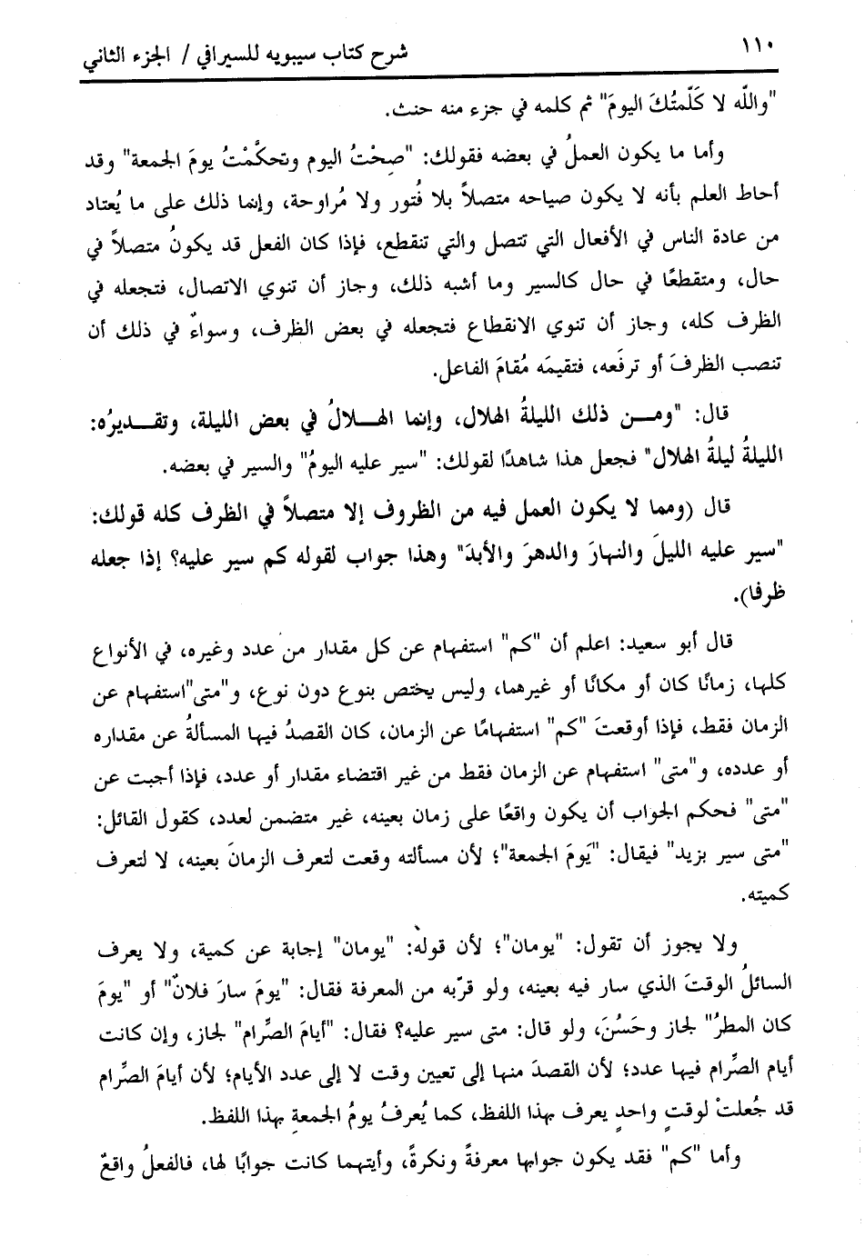 وأما ما يكون العمل في بعضه فقولك: " صحت اليوم وتحكّمت يوم الجمعة " وقد أحاط العلم بأنه لا يكون صياحه متصلا بلا فتور ولا مراوحة، وإنما ذلك على ما يعتاد من عادة الناس في الأفعال التي تتصل والتي تنقطع، فإذا كان الفعل قد يكون متصلا في حال، ومتقطعا في حال كالسير وما أشبه ذلك، وجاز أن تنوي الاتصال، فتجعله في الظرف كله، وجاز أن تنوي الانقطاع فتجعله في بعض الظرف، وسواء في ذلك أن تنصب الظرف أو ترفعه، فتقيمه مقام الفاعل.