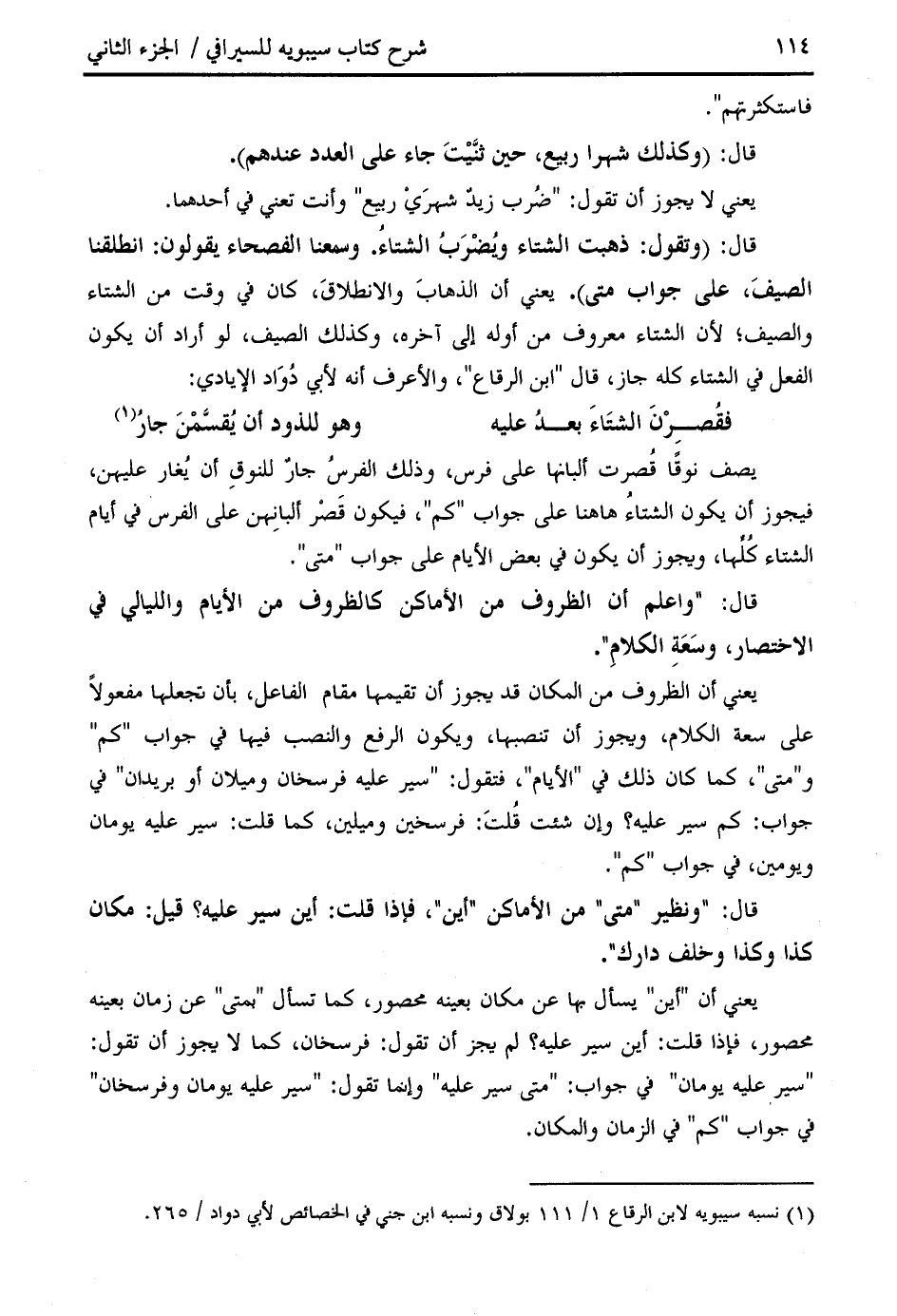 " سير عليه يومان " في جواب: " متى سير عليه " وإنما تقول: " سير عليه يومان وفرسخان " في جواب " كم " في الزمان والمكان.