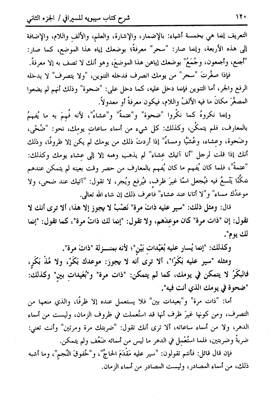 وإنما نكروه كما نكّروا " ضحوة " و " عتمة " و " عشاء "، لأنه فهم به ما يفهم بالمعارف، فلم يتمكّن، وكذلك: كل شيء من أسماء ساعات يومك، نحو: " ضحى، وضحوة، وعشاء، وعشيّا ومساء " إذا أردت ذلك من يومك لم يكن إلا ظروفا، وذلك أنك إذا قلت لرجل " أنا آتيك عشاء " لم يذهب وهمه إلا إلى عشاء يومك وكذلك: