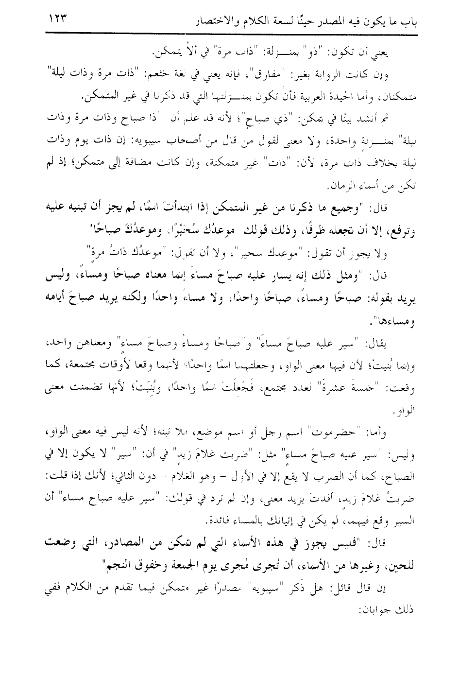 ثم أنشد بيتا في تمكن: " ذي صباح "؛ لأنه قد علم أن: " ذا صباح وذات مرة وذات ليلة " بمنزلة واحدة، ولا معنى لقول من قال من أصحاب سيبويه: إن ذات يوم وذات ليلة بخلاف ذات مرة، لأن: " ذات " غير متمكنة، وإن كانت مضافة إلى متمكن؛ إذ لم تكن من أسماء الزمان.