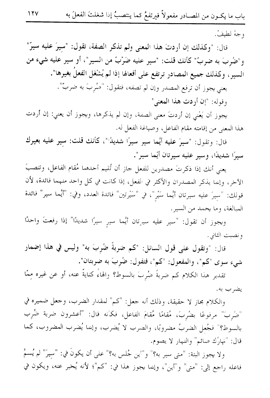 قال: " وكذلك إن أردت هذا المعنى ولم تذكر الصفة، تقول: " سير عليه سير " و " ضرب به ضرب " كأنك قلت: " سير عليه ضرب من السير "، أو سير عليه شيء من السير، وكذلك جميع المصادر ترتفع على أفعالها إذا لم يشغل الفعل بغيرها ".