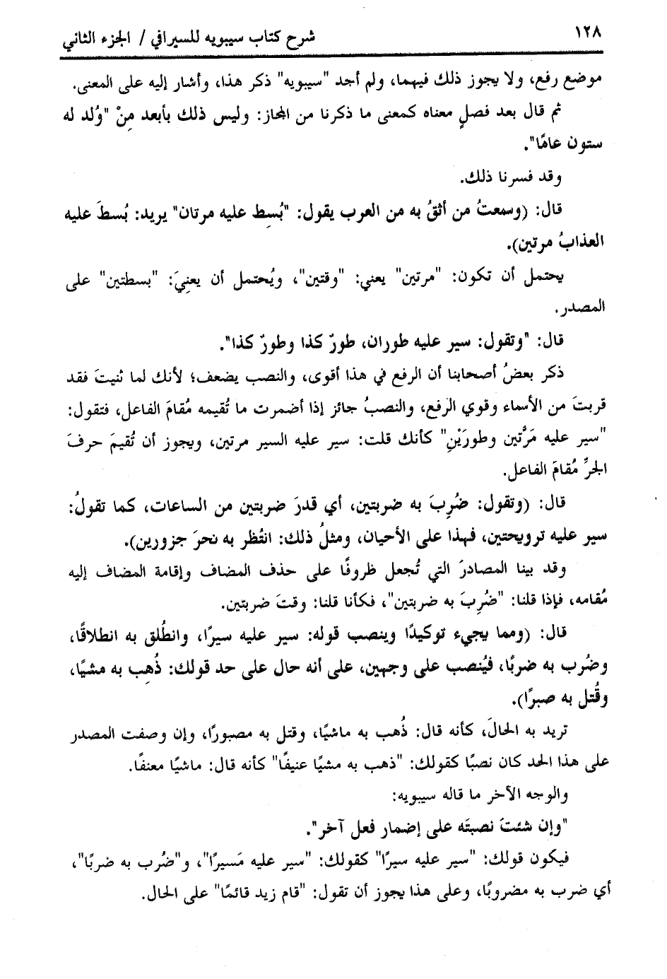 قال: (ومما يجيء توكيدا وينصب قوله: سير عليه سيرا، وانطلق به انطلاقا، وضرب به ضربا، فينصب على وجهين، على أنه حال على حد قولك: ذهب به مشيا، وقتل به صبرا).