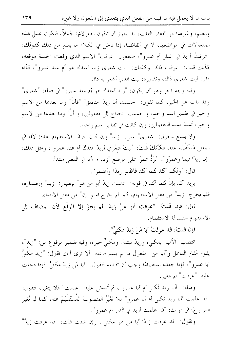 " عرفت أزيد في الدار أم عمرو "، فمفعول " عرفت " الاسم الذي وقعت الجملة موقعه، كأنك قلت: " عرفت ذاك " وكذلك: " ليت شعري زيد أعندك هو أم عند عمرو "، كأنه قال: ليت شعري ذاك، وتقديره: ليت الذي أشعر به ذاك.