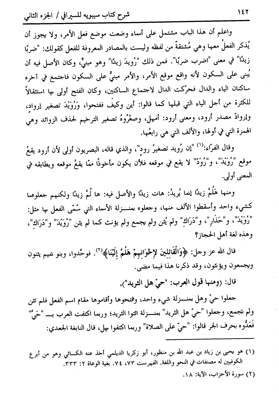 واعلم أن هذا الباب مشتمل على أسماء وضعت موضع فعل الأمر، ولا يجوز أن يذكر الفعل معها وهي مشتقة من لفظه وليست بالمصادر المعروفة للفعل كقولك: " ضربا زيدا " في معنى " اضرب ضربا ". فمن ذلك " رويد زيدا " وهو مبنيّ، وكان الأصل فيه أن يبنى على السكون لأنه واقع موقع الأمر، والأمر مبنيّ على السكون فاجتمع في آخره ساكنان الياء والدال فحرّكت الدال لاجتماع الساكنين، وكان الفتح أولى بها استثقالا للكثرة من أجل الياء التي قبلها كما قالوا: أين وكيف ففتحوا، ورويد تصغير إرواد، وإرواد مصدر أرود، ومعنى أرود: أمهل، وصغّروه تصغير الترخيم لحذف الزوائد وهي الهمزة التي في أولها، والألف التي هي رابعها.