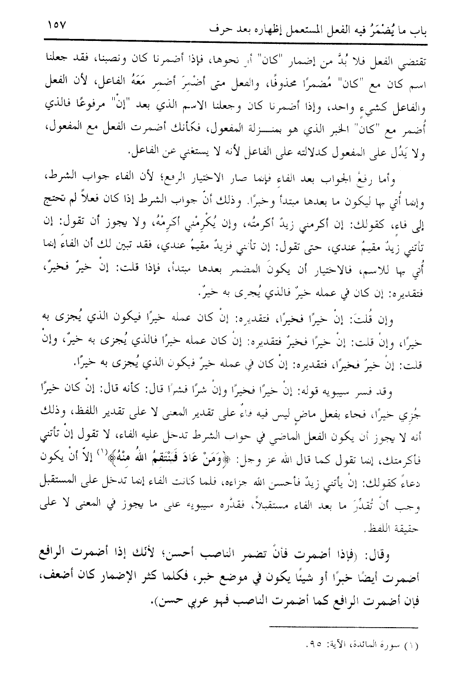 وقد فسر سيبويه قوله: إن خيرا فخيرا وإن شرا فشرا قال: كأنه قال: إن كان خيرا جزي خيرا، فجاء بفعل ماض ليس فيه فاء على تقدير المعنى لا على تقدير اللفظ، وذلك أنه لا يجوز أن يكون الفعل الماضي في جواب الشرط تدخل عليه الفاء، لا تقول إن تأتني فأكرمتك، إنما تقول كما قال الله عز وجل: وَمَنْ عادَ فَيَنْتَقِمُ اللَّهُ مِنْهُ (¬1) إلّا أن